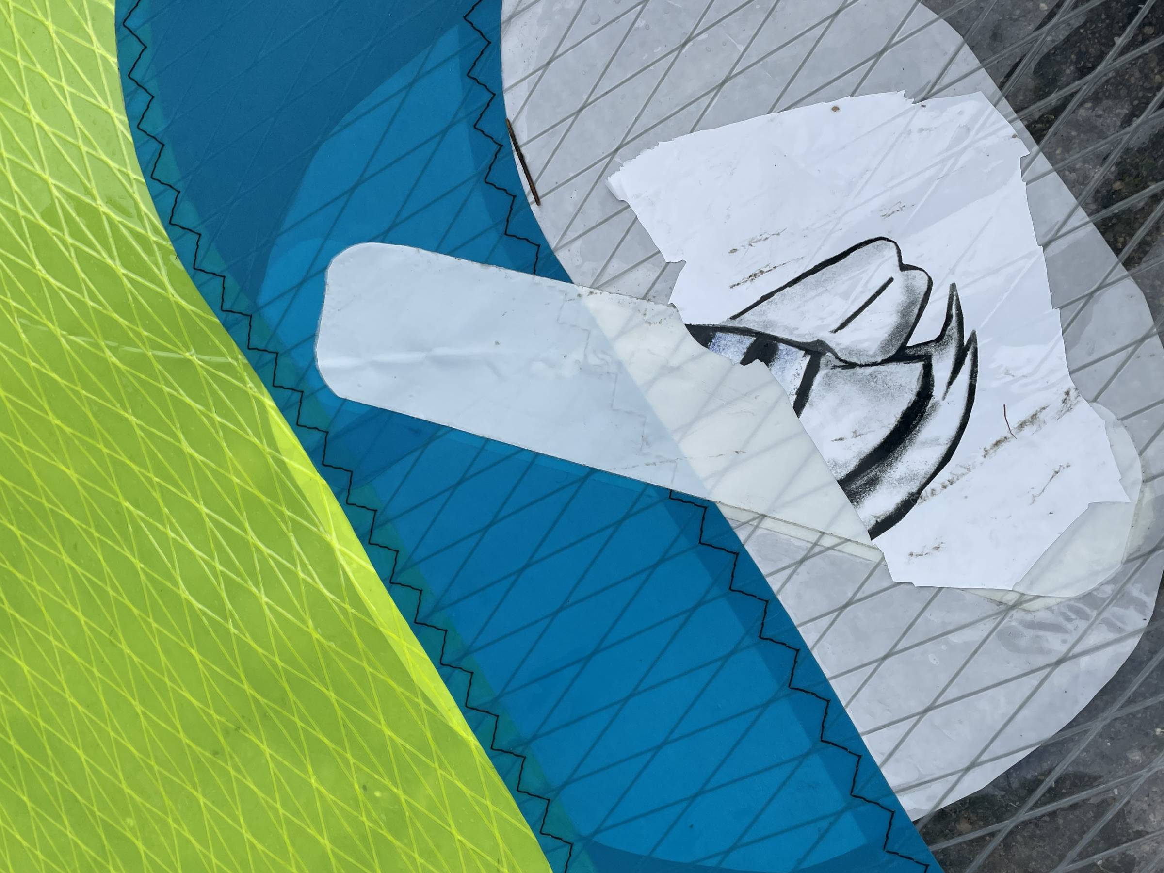 Hinter dem großen runden Aufkleber ist ein Kratzer. Da ist wahrscheinlich jemand mit einer Finne o.ä. langgekratzt, als das Segel am Strand lag. Ist aber nicht durch! Du kannst das an dem leichten Strich rechts des Aufklebers erkennen.