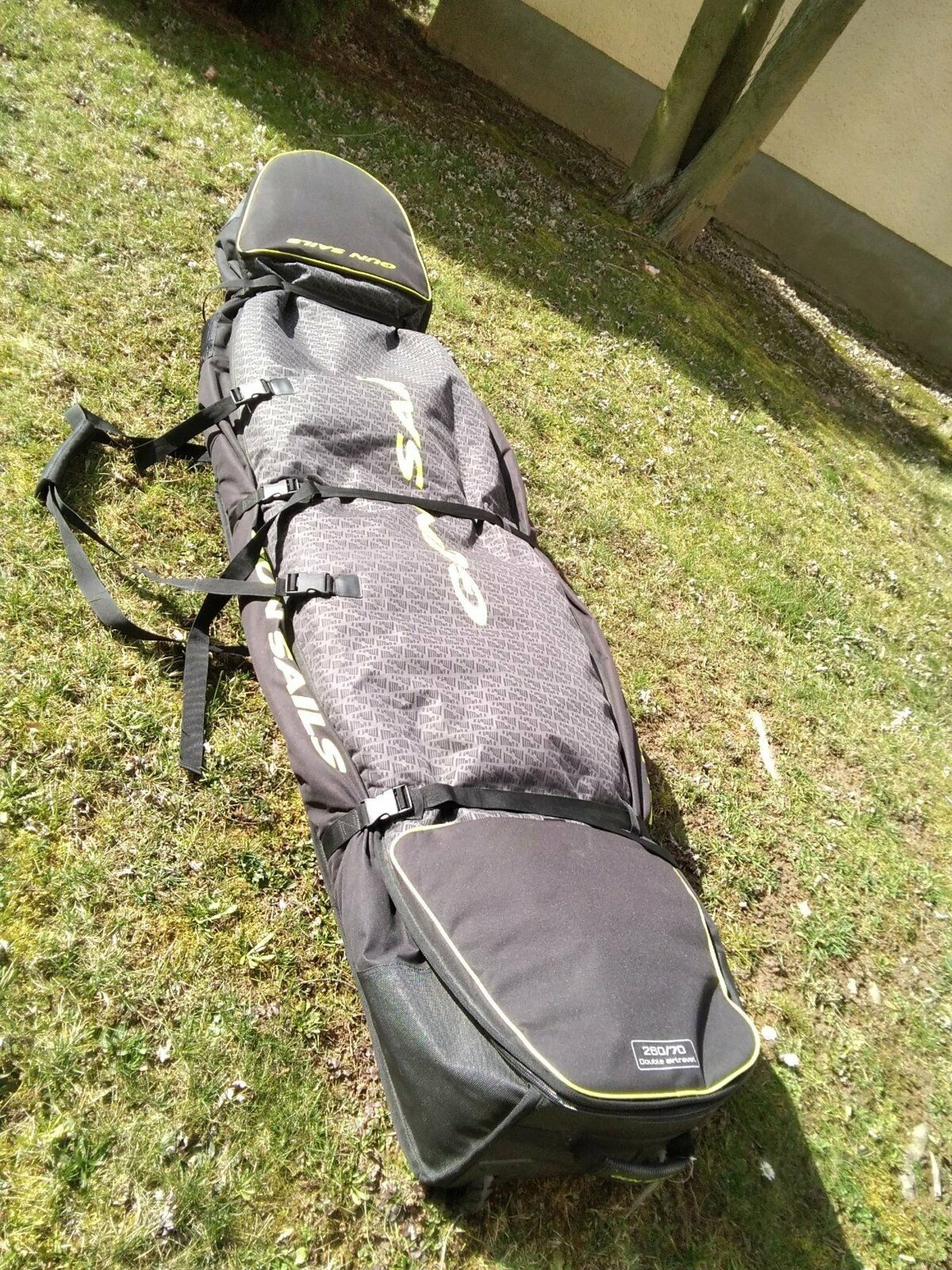 Zum Board gibt es eine Tasche von Gunsails; für 2 Boards,mit Rädern. Länge der Boardbag beträgt 3,70m.