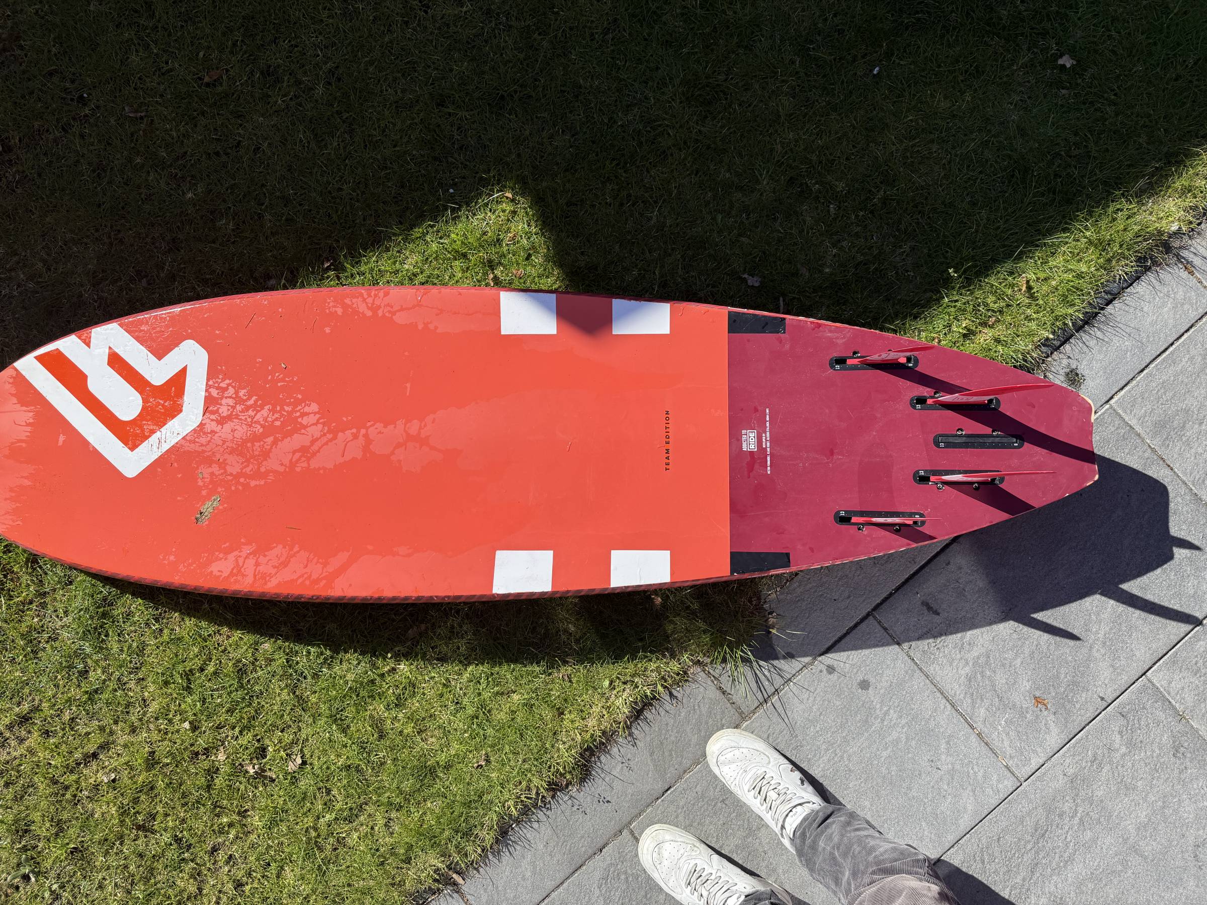 Bei dem Board sind die original Finnen und Fußschlaufen dabei.