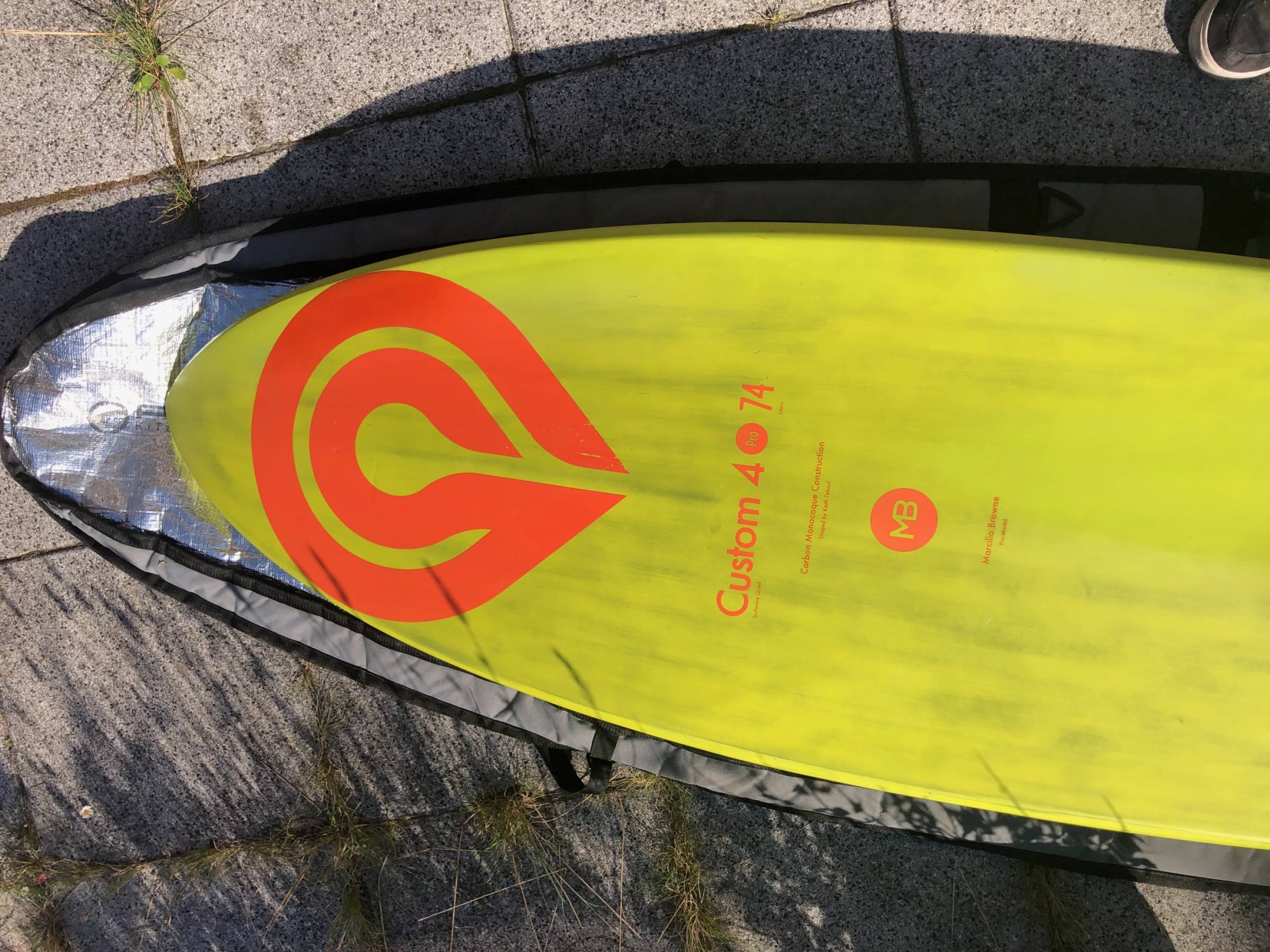 Gebraucht, sehr guter Zustand, eine oberflächliche Macke am Unterwasserschiff wurde fachmännisch repariert, kein Wasser gezogen, sonst keine relevanten Beschädigungen, inkl. original MFC Finnen und Straps.