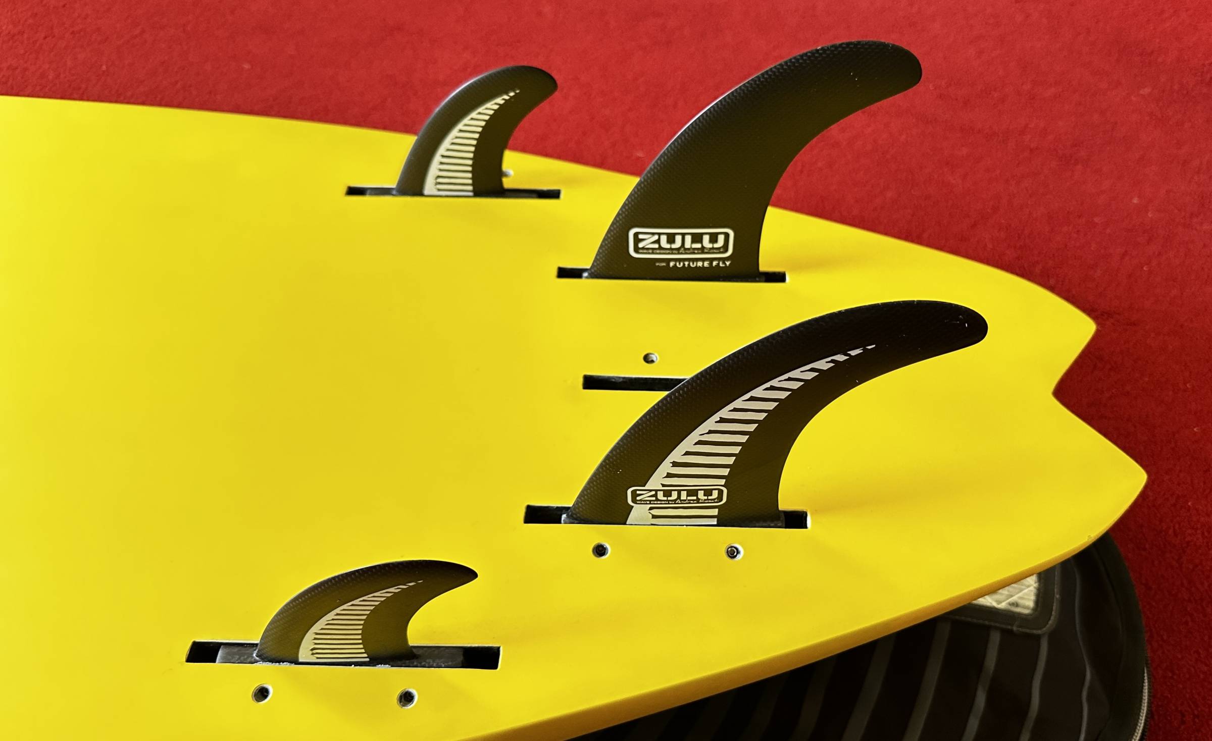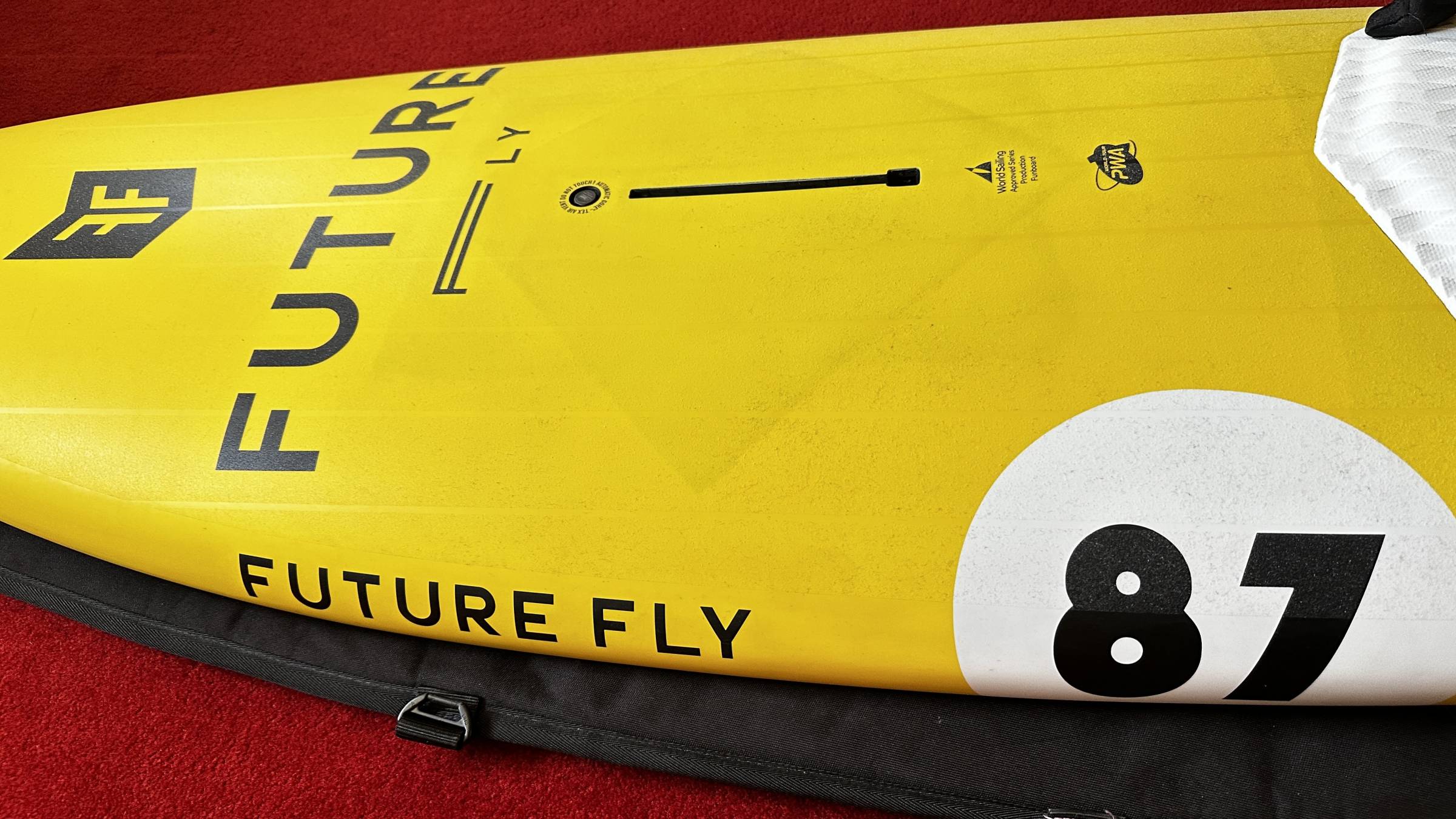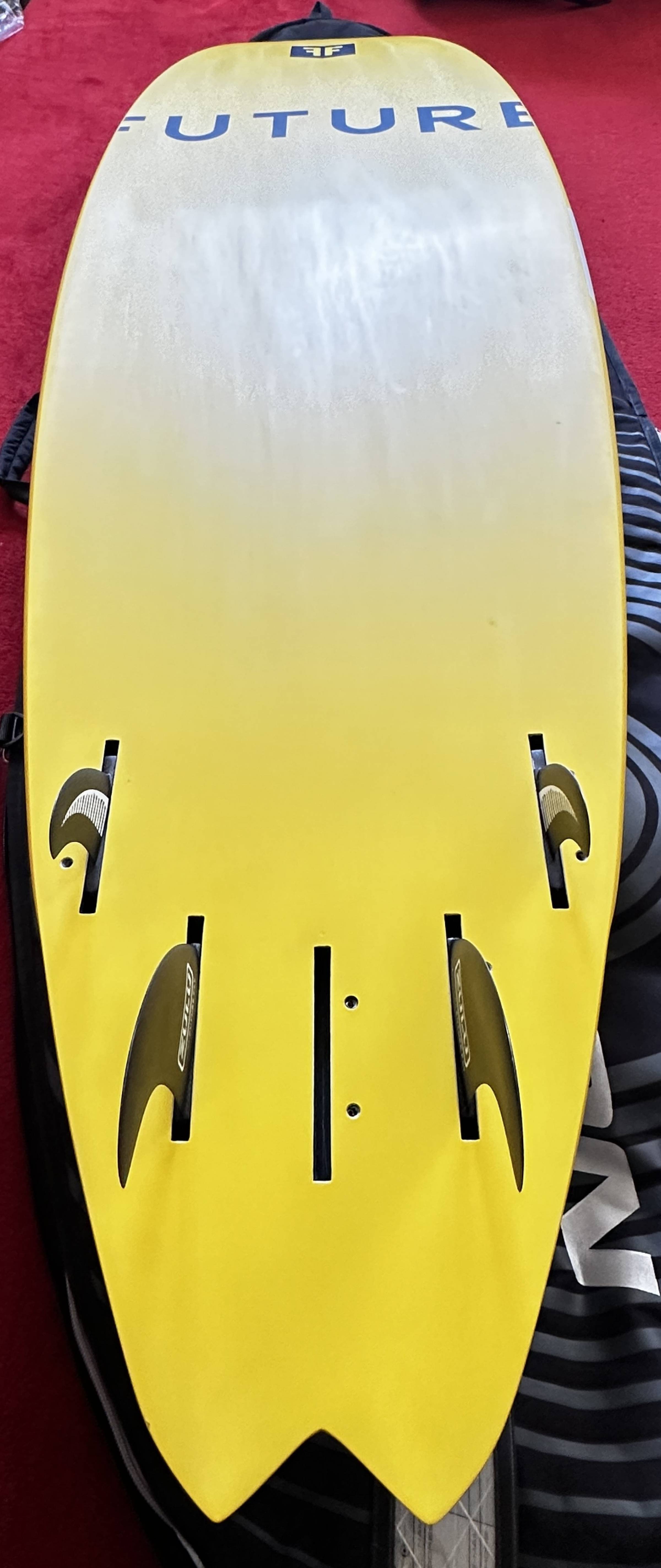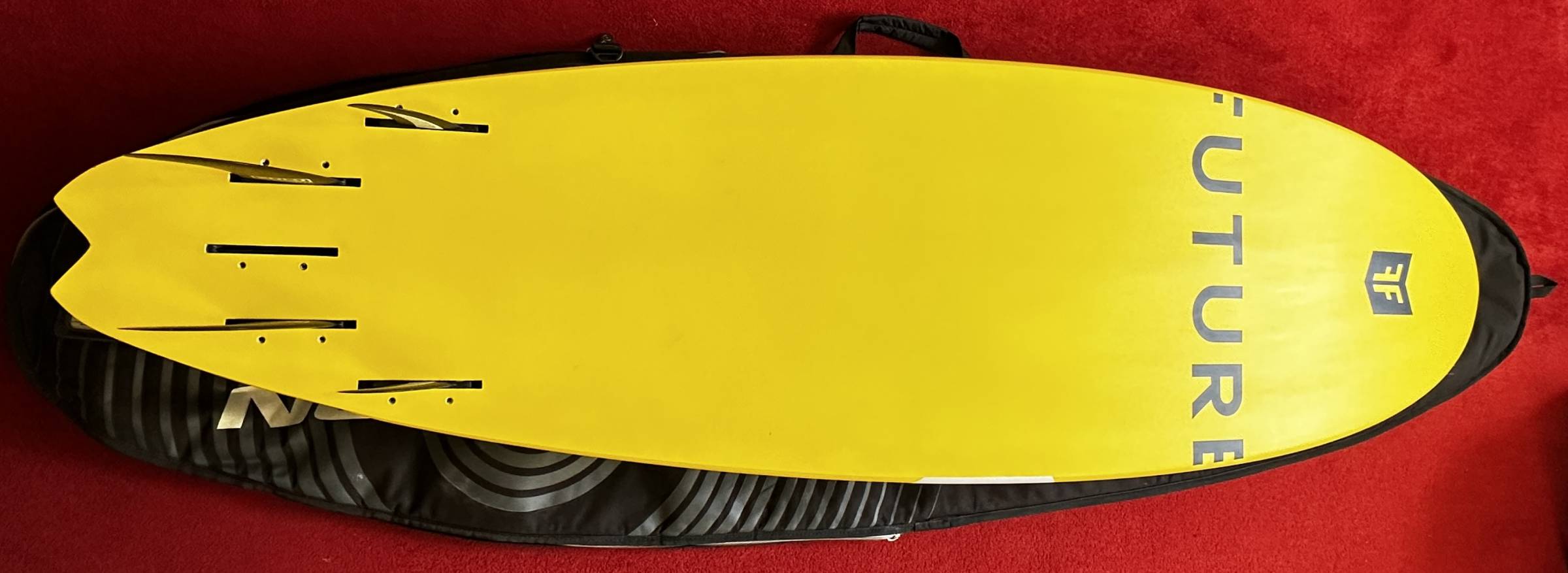Das Board kommt mit sehr bequemen Schlaufen (doppelt verschraubt), 4 hochwertigen Carbon-Finnen und einem Neil Pryde Boardbag.