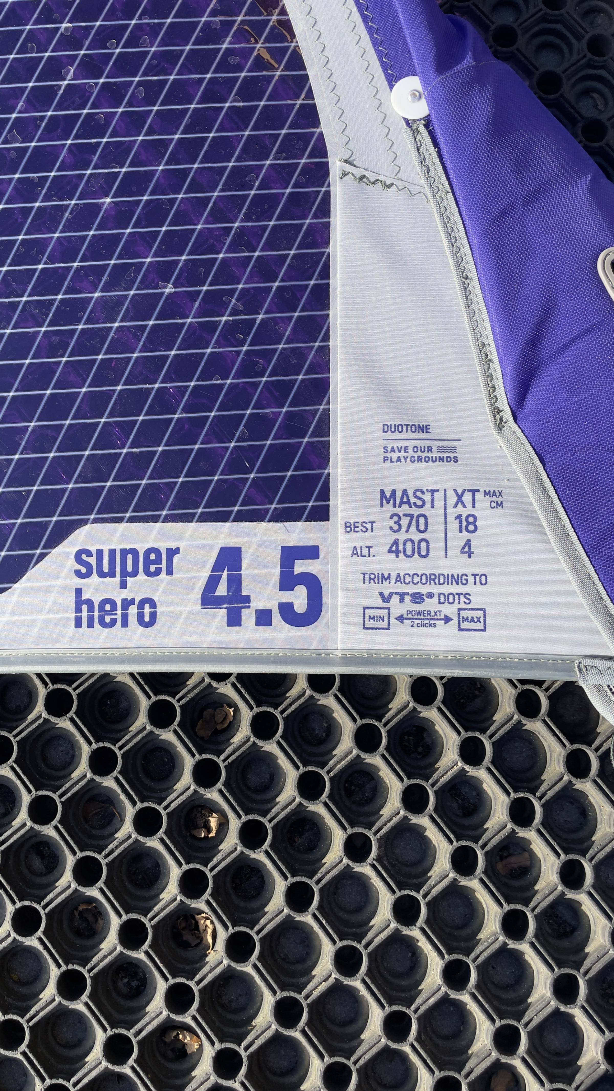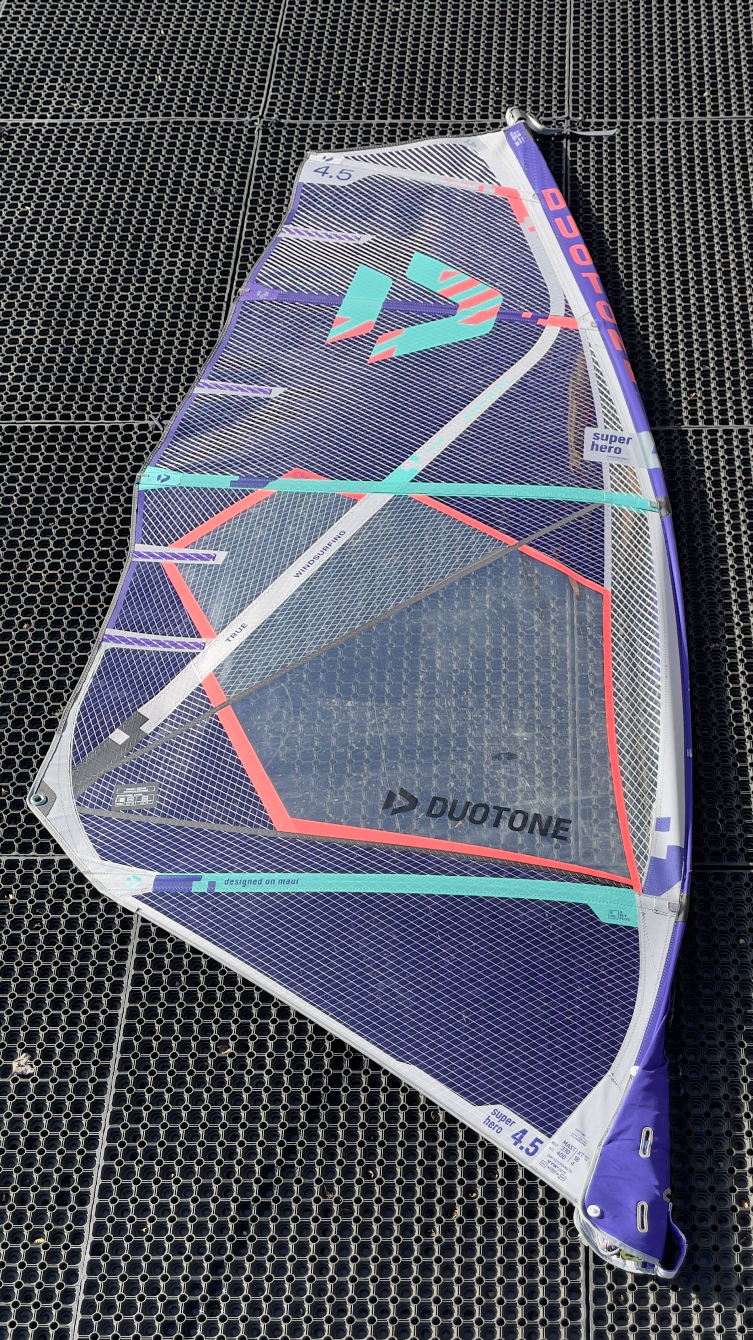 Wir verkaufen das Duotone super hero 4,5 aus dem Jahr 2025. Das Segel war bei uns im Verleih im Einsatz, ist aber noch in einem guten Zustand.