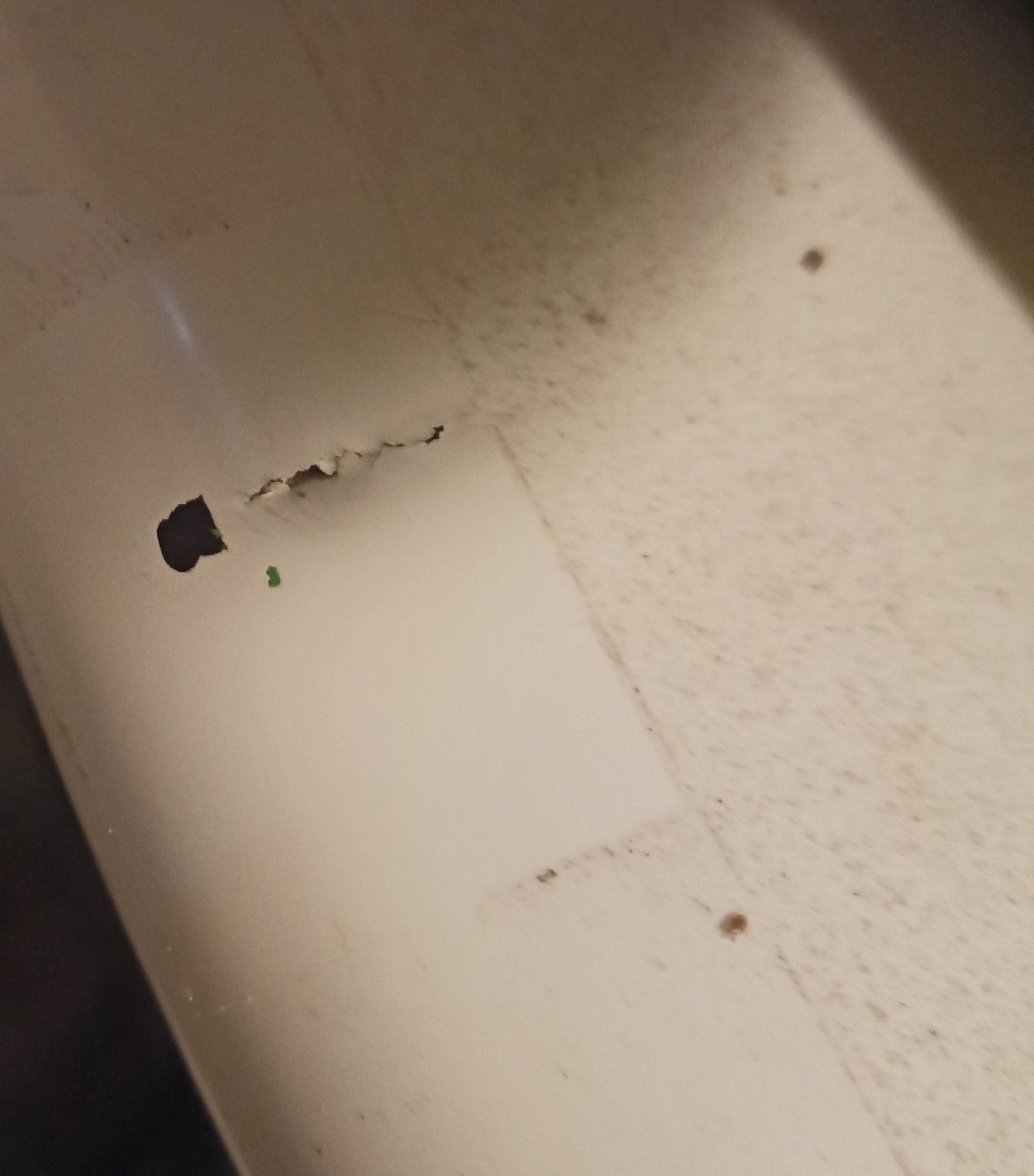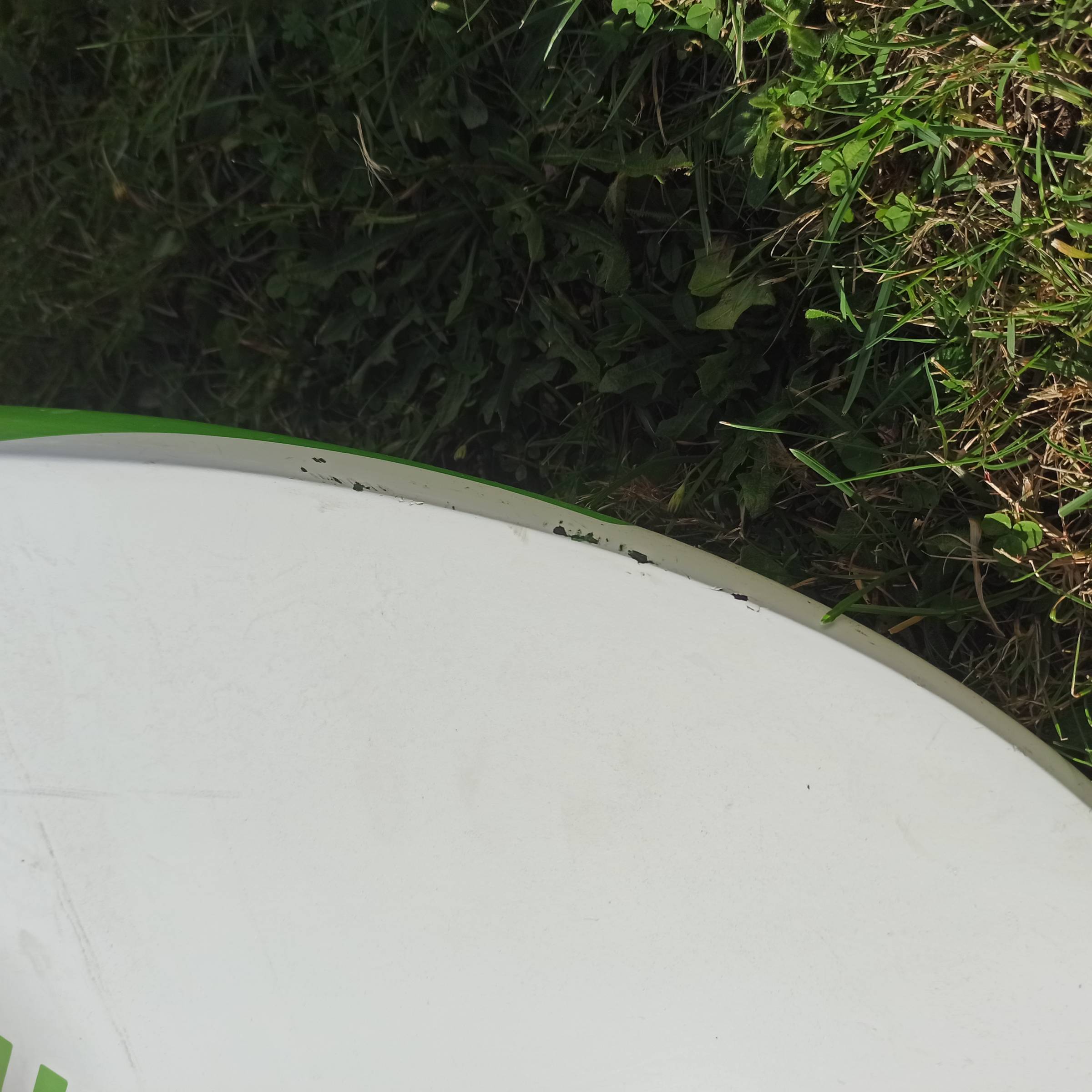 Ein kleiner Riss von ca. 2cm Länge im vorderen Bereich (siehe Foto). Trocken, kein Wassereintritt. Einmal kurz anschleifen und mit Solarez abdichten, fertig. Kann ich auf Wunsch auch machen.