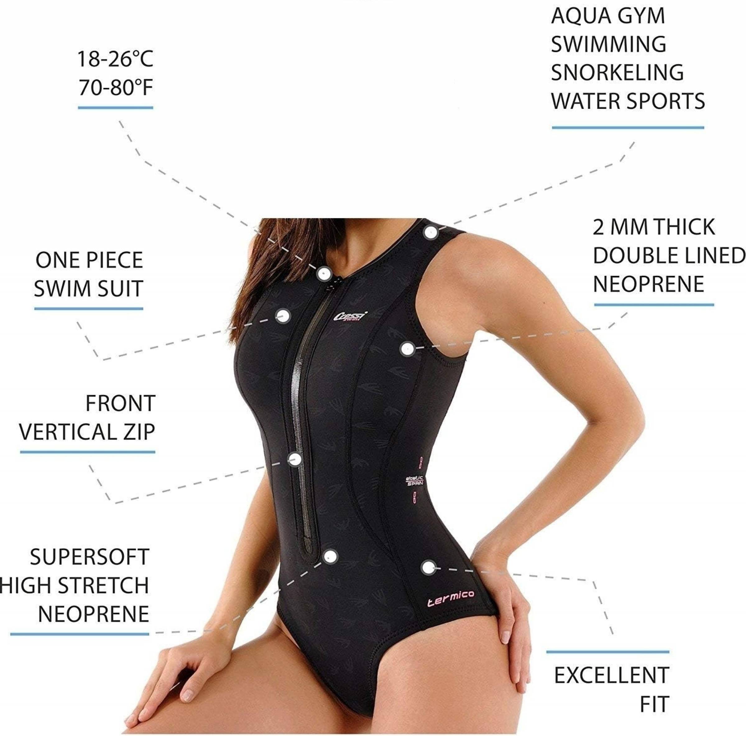 Einteiliger Tauchbadeanzug für Damen: Aus weichem, doppelt gepolstertem Neopren 2 mm ist der Termico für Temperaturen zwischen 18 und 26°C empfohlen. Er erlaubt dank seines besonderen Schnitts und des dehnfähigen Materials eine große Bewegungsfreiheit