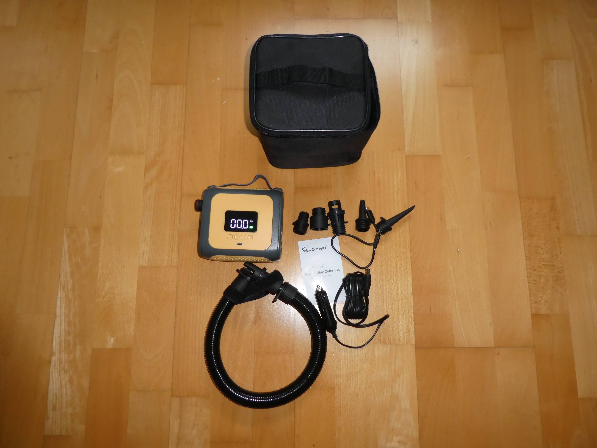 inkl. Ladekabel (USB-C/12V), Tasche, Schlauch und zahlreiche Adapter.