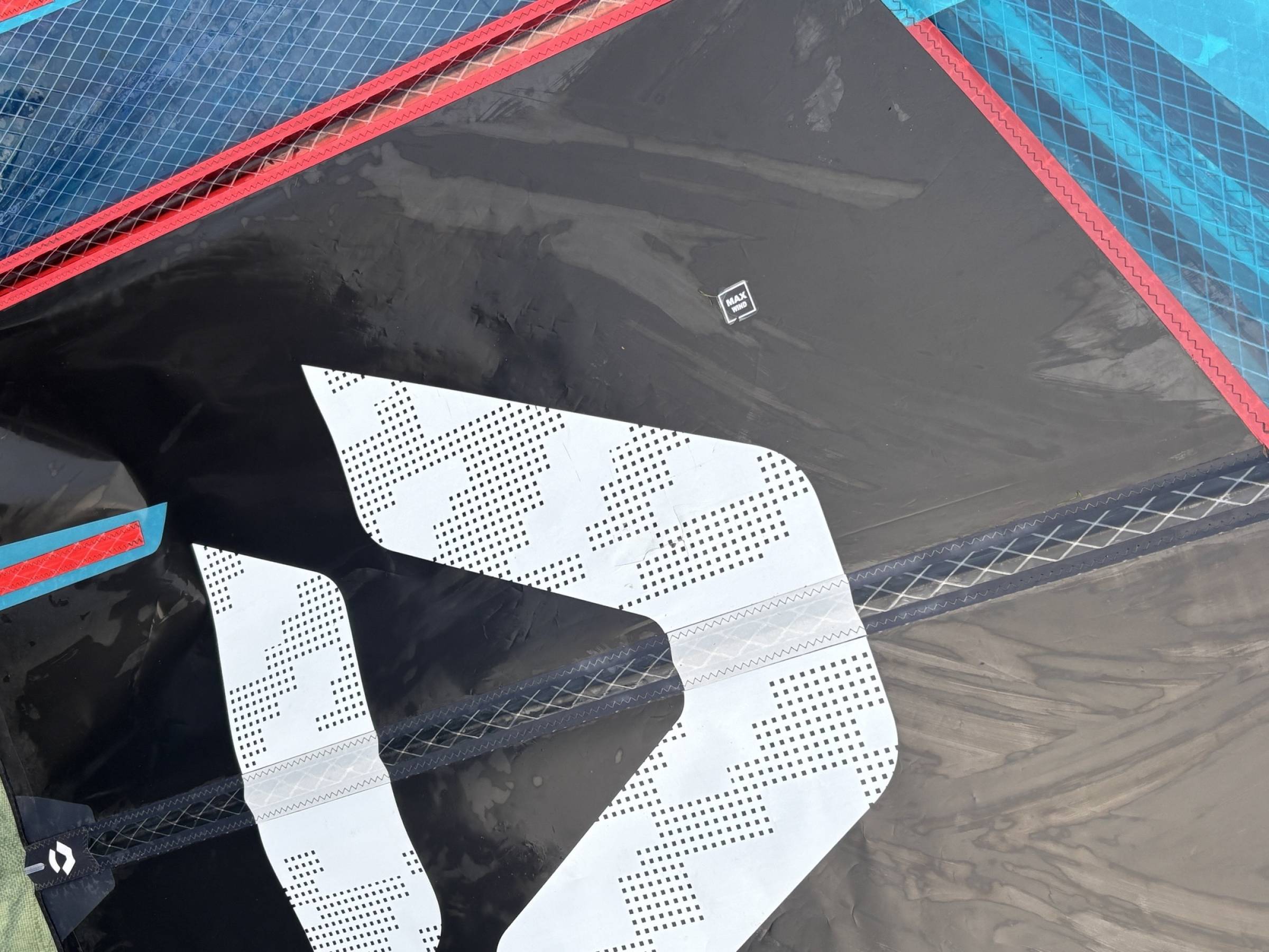 Das Segel hatte im Bereich des Duotonezeiches ein kleines Loch, das wahrscheinlich durch eine Finne beschädigt wurde. Dieses ist mit Monofilm repariert und nicht wirklich sichtbar. In diesem Bereich liegt keine Spannung auf dem Monofilm, also harmlos.