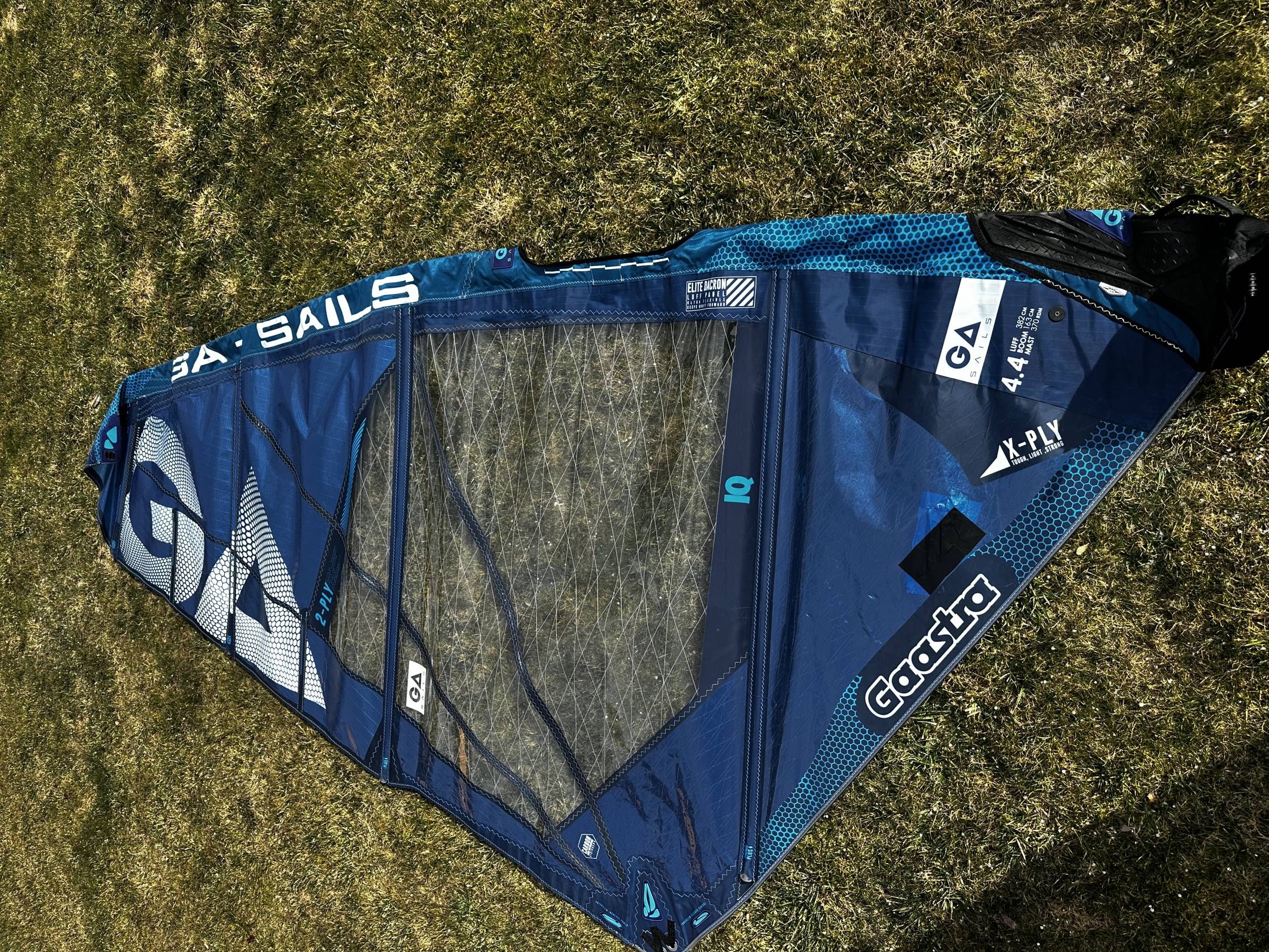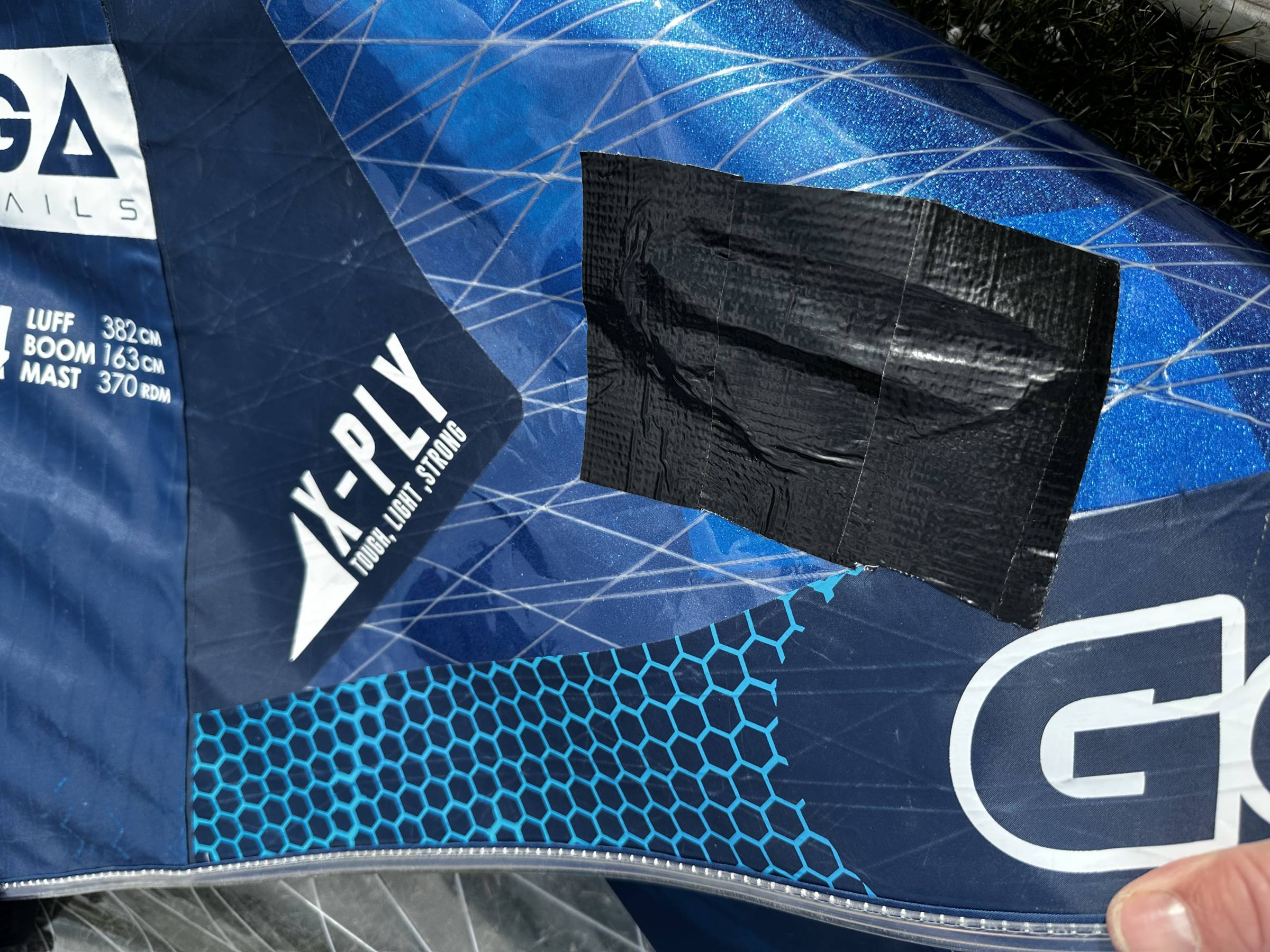 Das Segel hat einen kleinen Riss im Unterliek. Ich habe einfach ein wenig Tape drübergeklebt - hält, hat keine Auswirkungen auf die Fahreigenschaften.