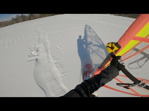 Cruising in deep snow on a frozen lake with a windsurf board? Here you can see how it works. A short piece of wood served as the fin. To keep the track on snow, a low draft is sufficient. However, the old Fanatic plank was difficult to keep on track in tight turns. Windsurf boards are made for water. Nevertheless, the rider was happy and looking forward to the next ride, here he was riding on snow with a 3.7 sail.