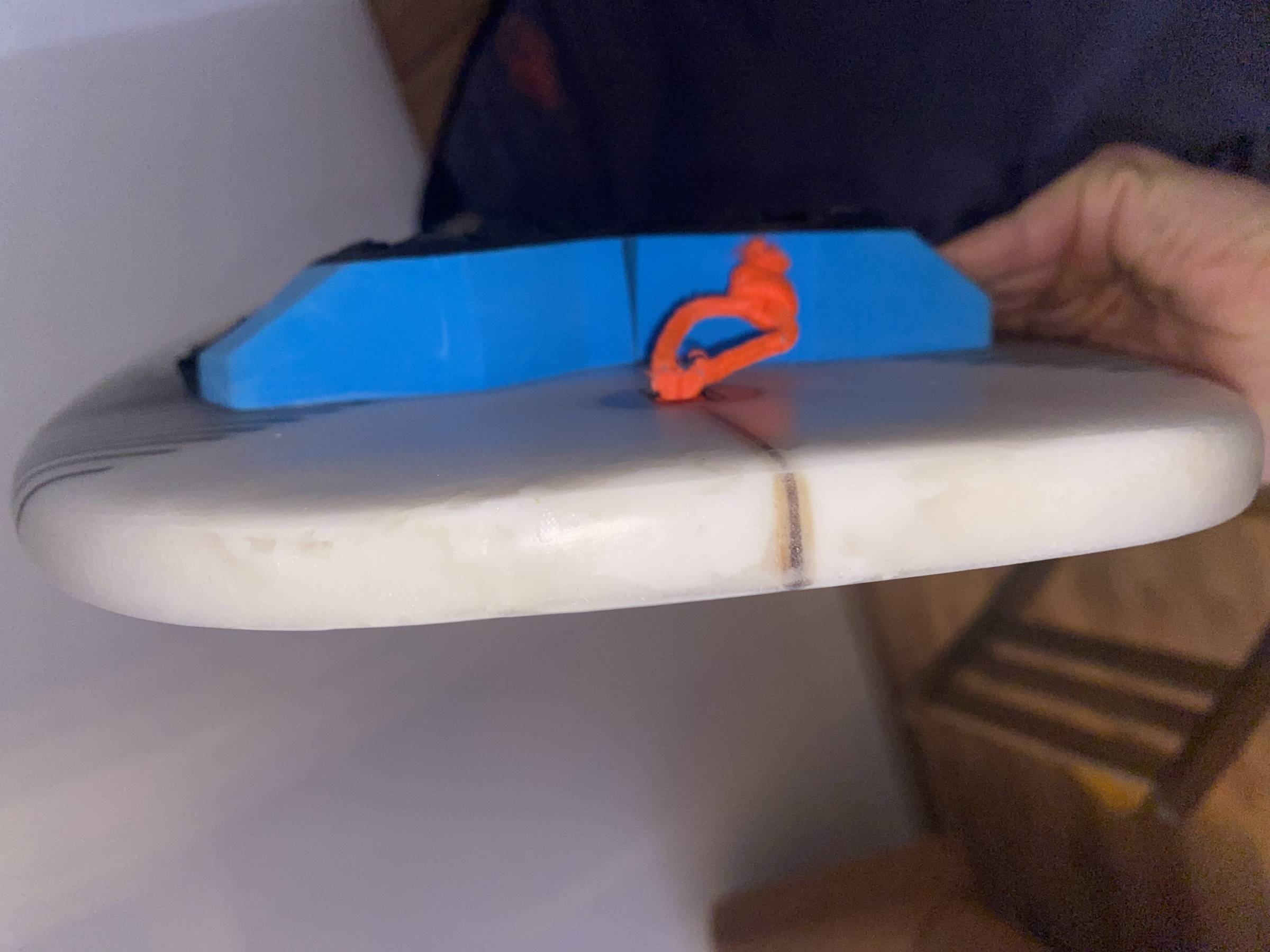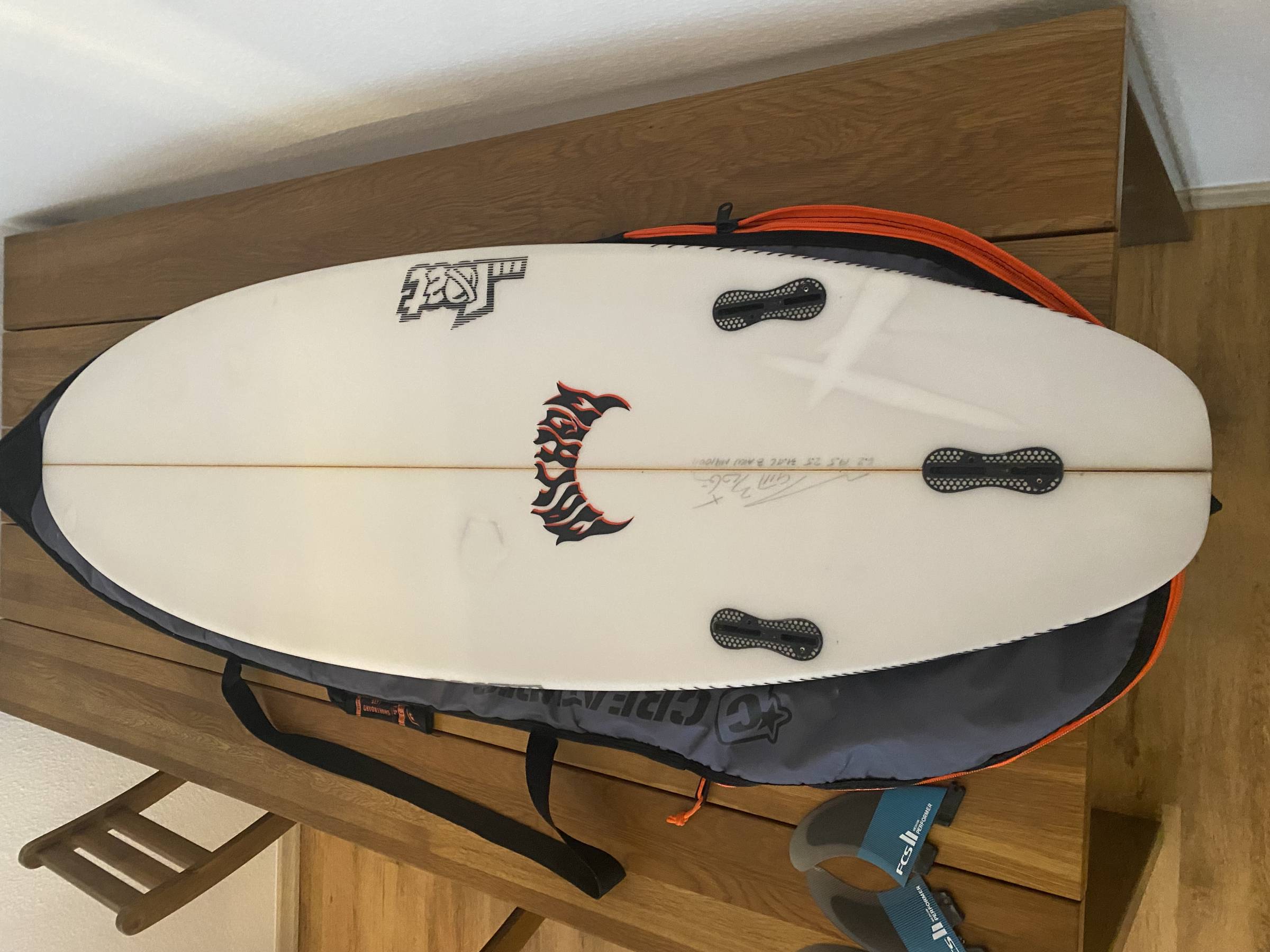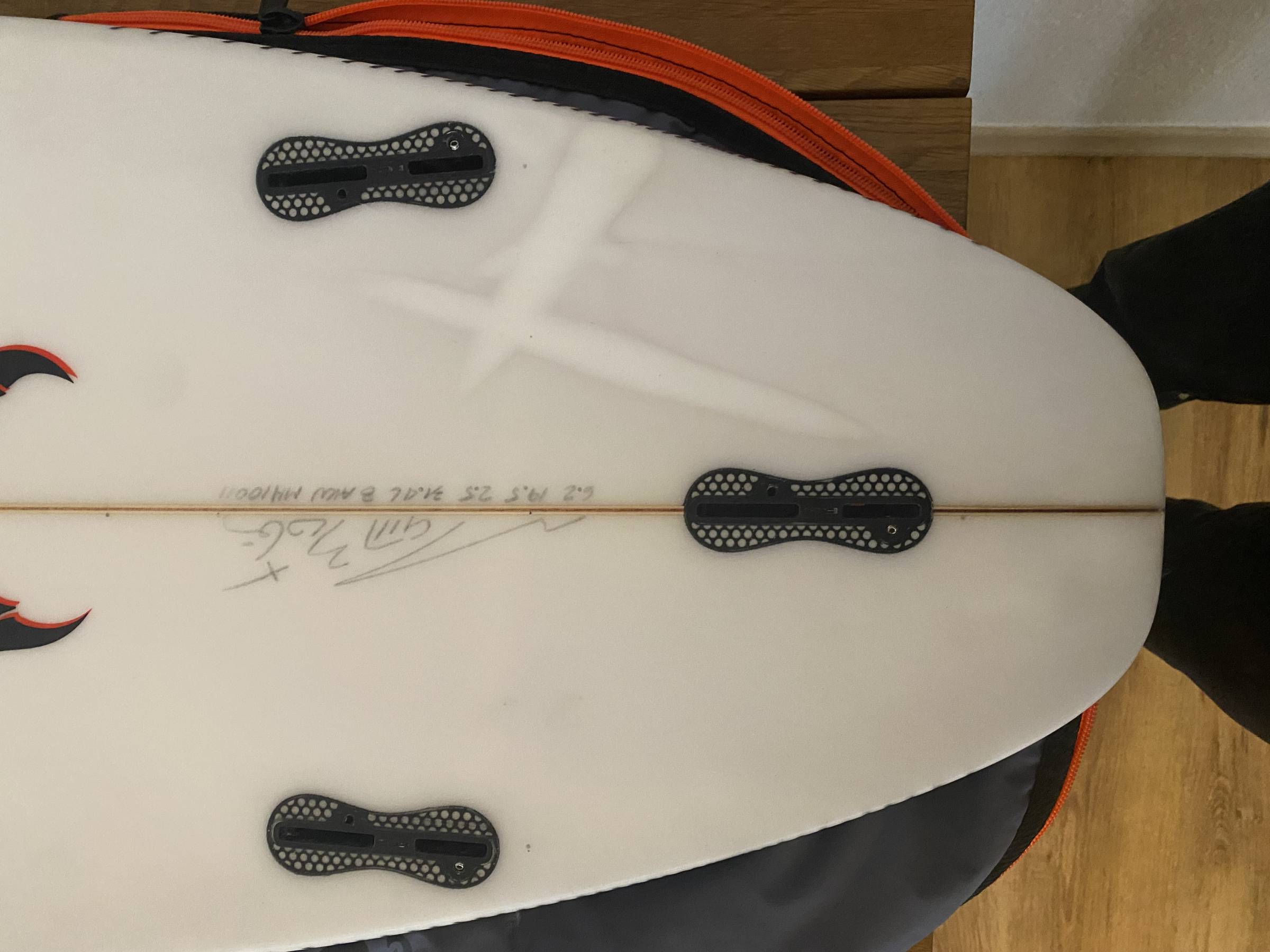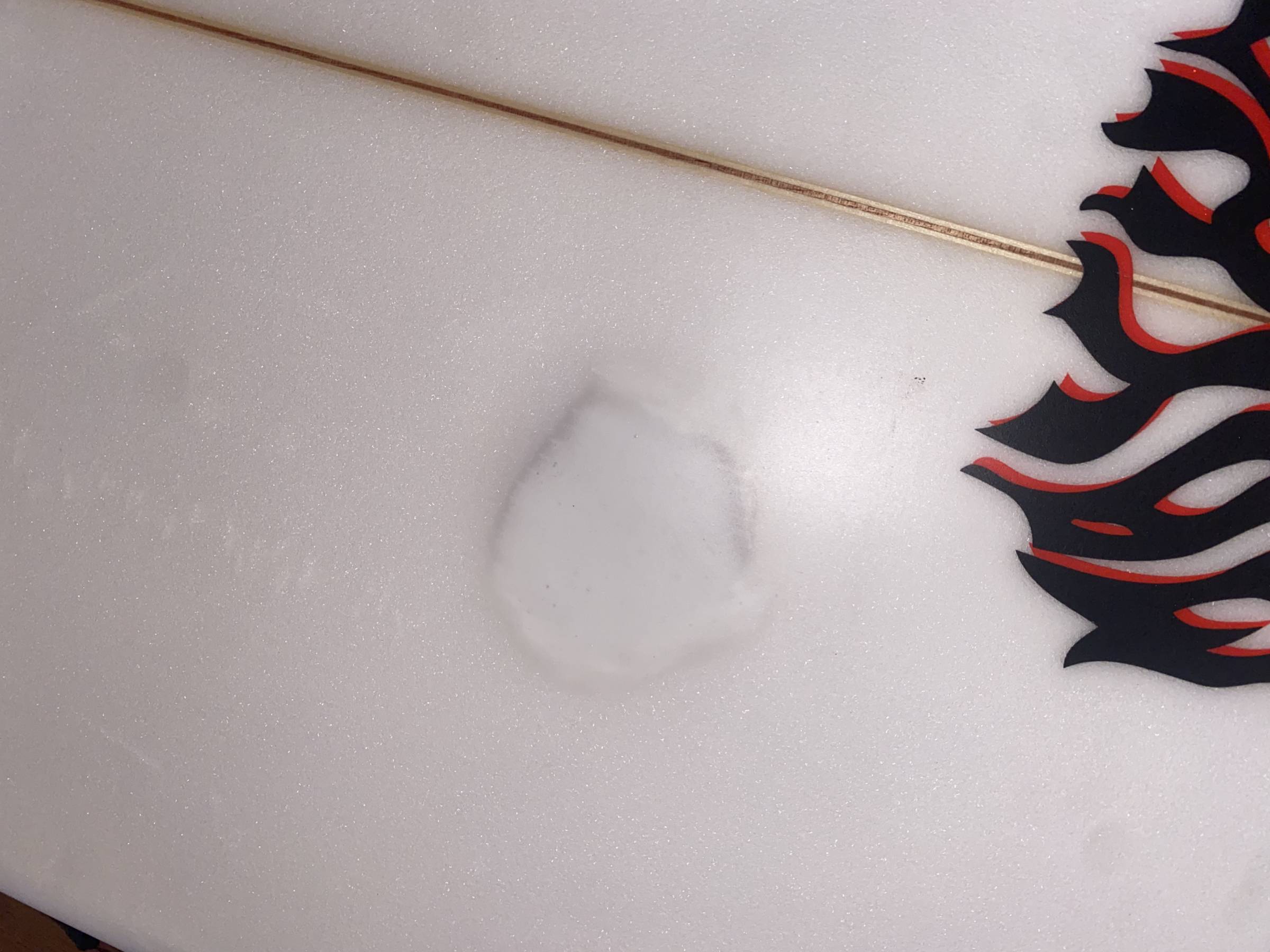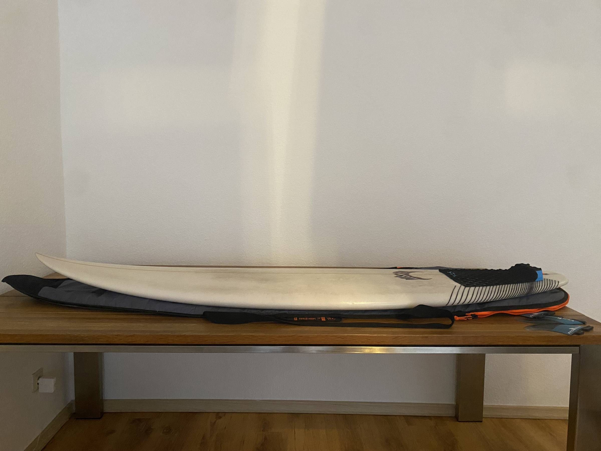 Das Brett war schon überall mit im Urlaub und hatte dementsprechend ein paar Dings. Wasser gezogen, hat es jedoch nicht. Ich habe die Stellen alle professionell reparieren lassen, sodass die Oberfläche wieder glatt ist und die Performance nicht beeinträchtigt wird. Einzig an der helleren Farbe, kann man nun sehen, wo es beschädigt war.