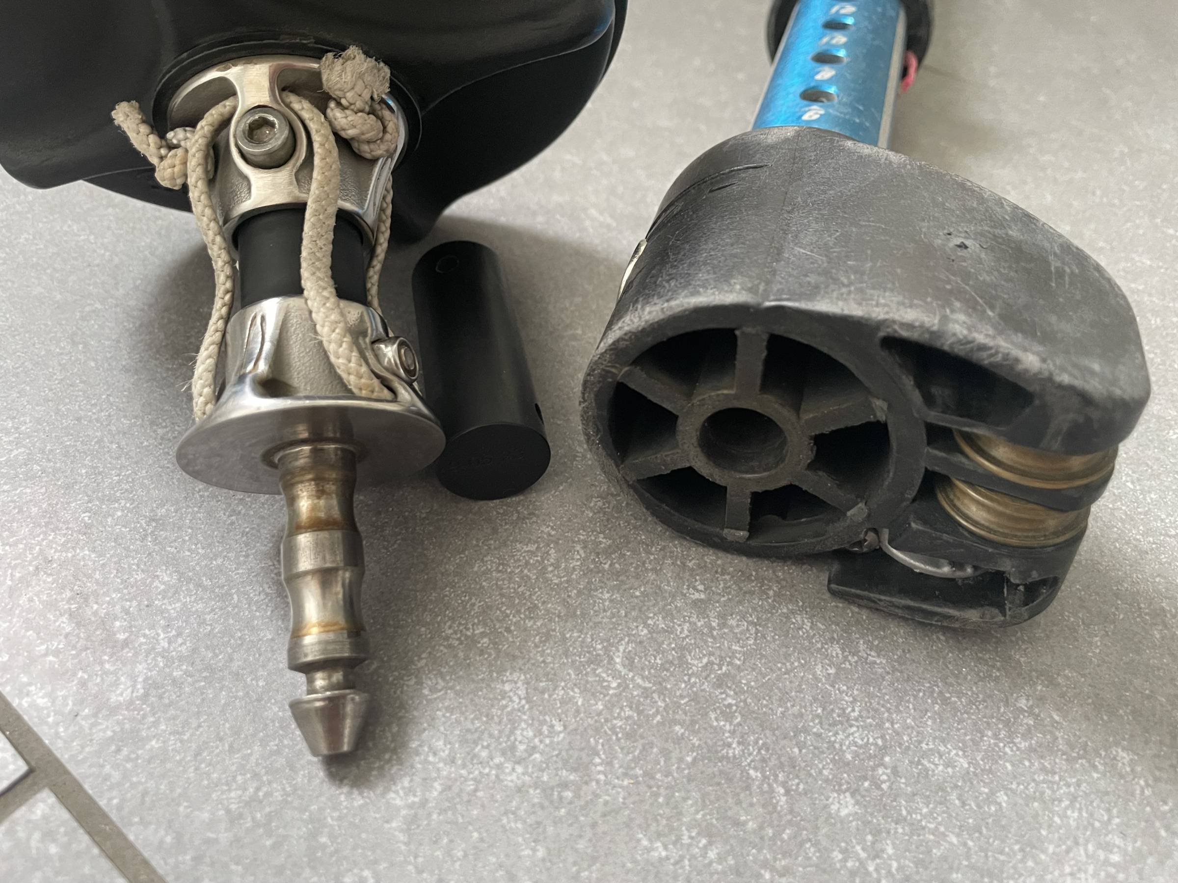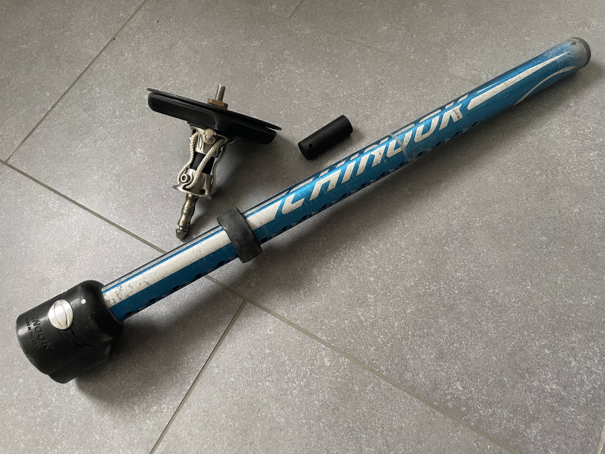 Verkaufe die stabile Chinook Mastbase mit Verlängerung (Max 38 cm). Die Verlängerung hat zum Mastfuss ein bisschen Spiel (siehe Foto 3), hat mich aber nie gestört. Eine neue Joint-Sehne lege ich auch noch mit dazu (NP 25 Euro).
