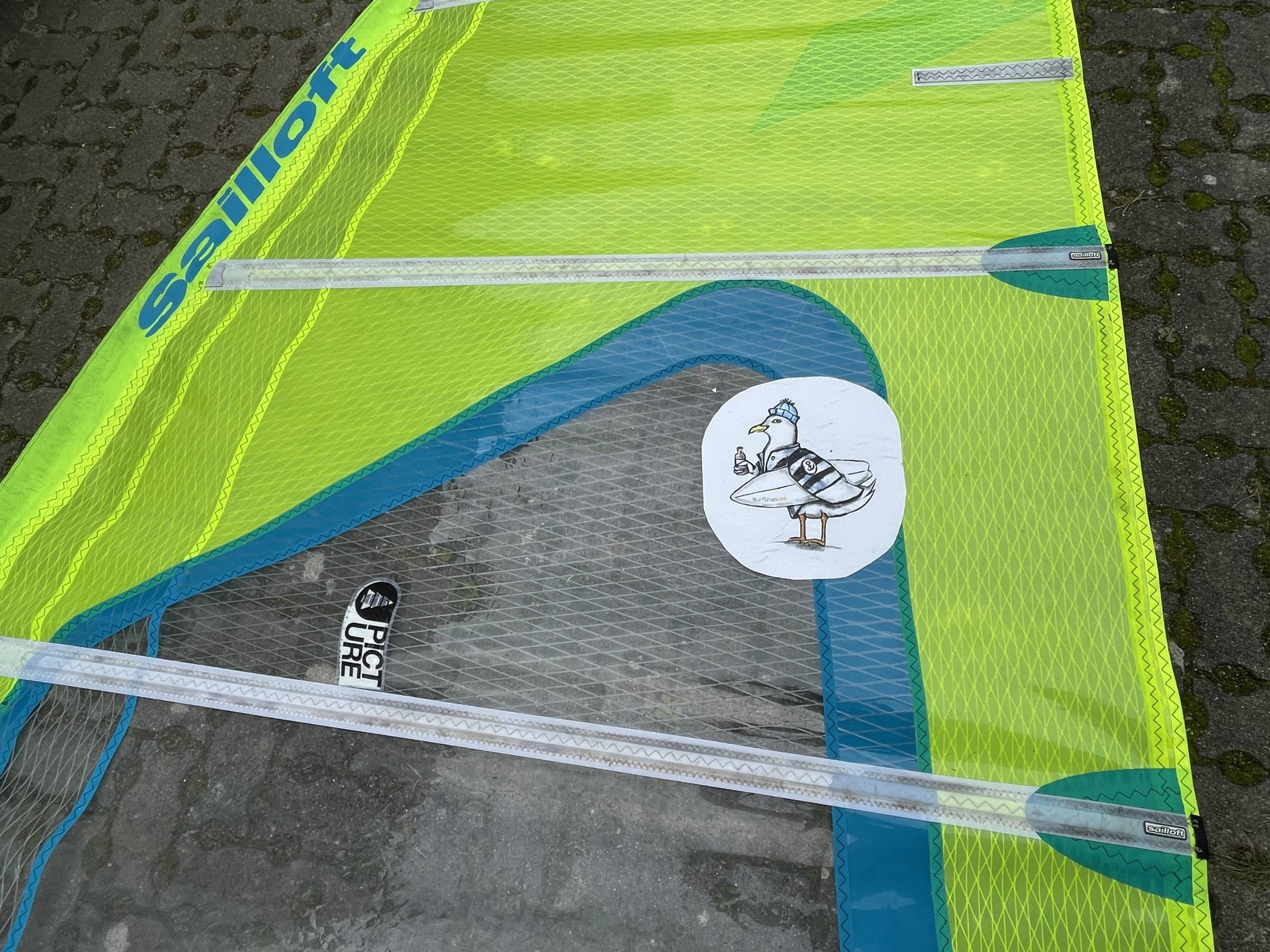 Das Segel ist in einem guten Zustand. Das 5,3‘er ist aus 2019 und hat keine Reparatur. Die üblichen Spuren vom auf- und abbauen sind natürlich vorhanden.