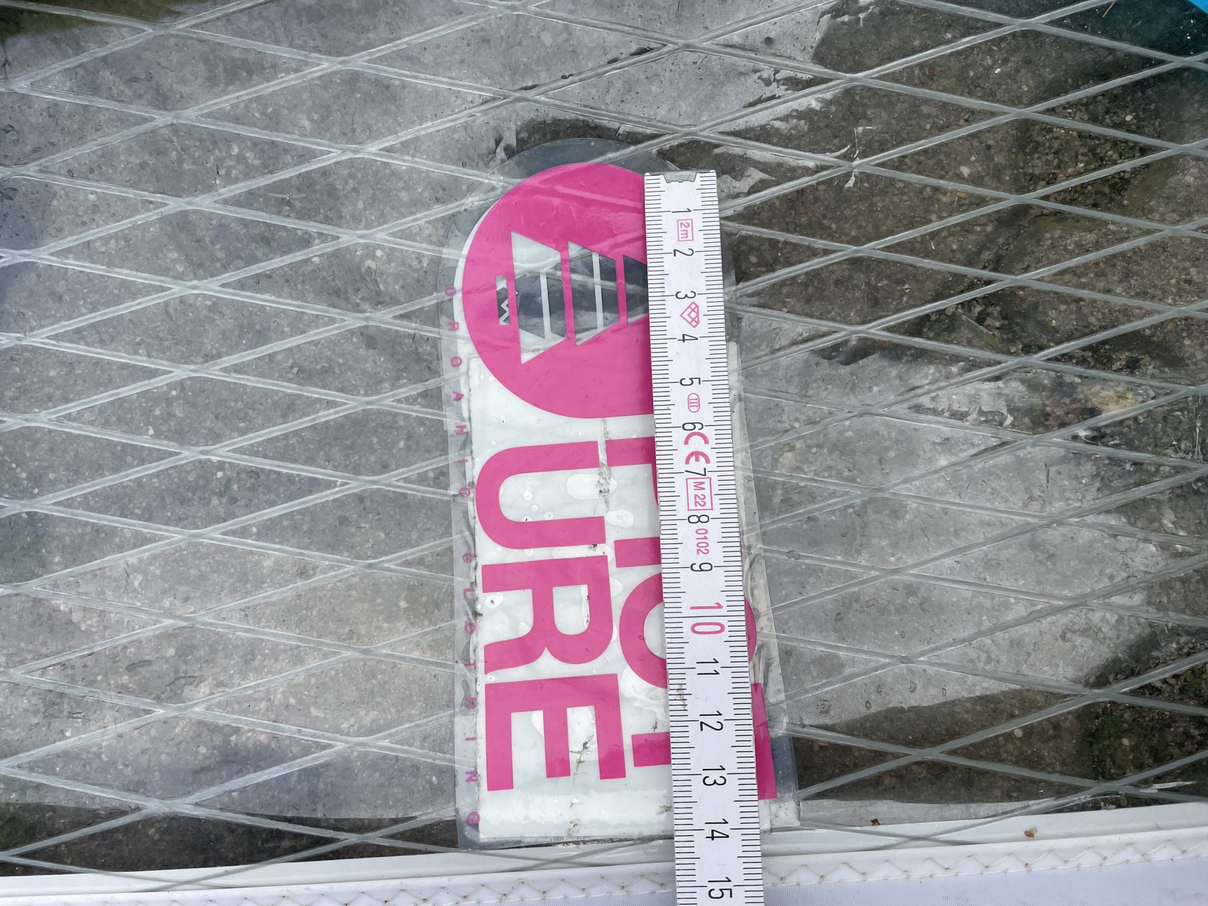 Hinter dem großen runden Aufkleber ist ein Kratzer. Da ist wahrscheinlich jemand mit einer Finne o.ä. langgekratzt, als das Segel am Strand lag. Ist aber nicht durch! Du kannst das an dem leichten Strich rechts des Aufklebers erkennen.