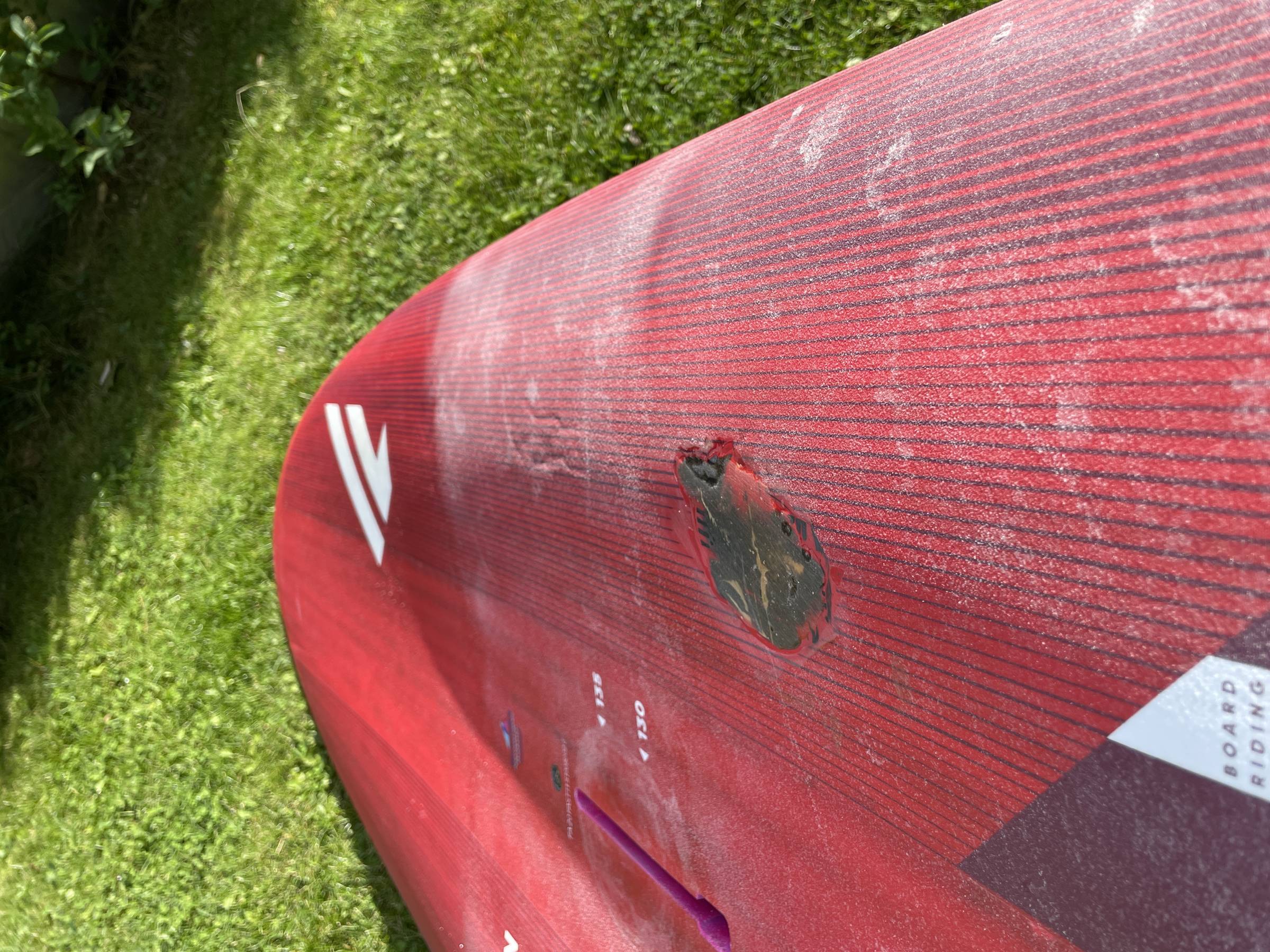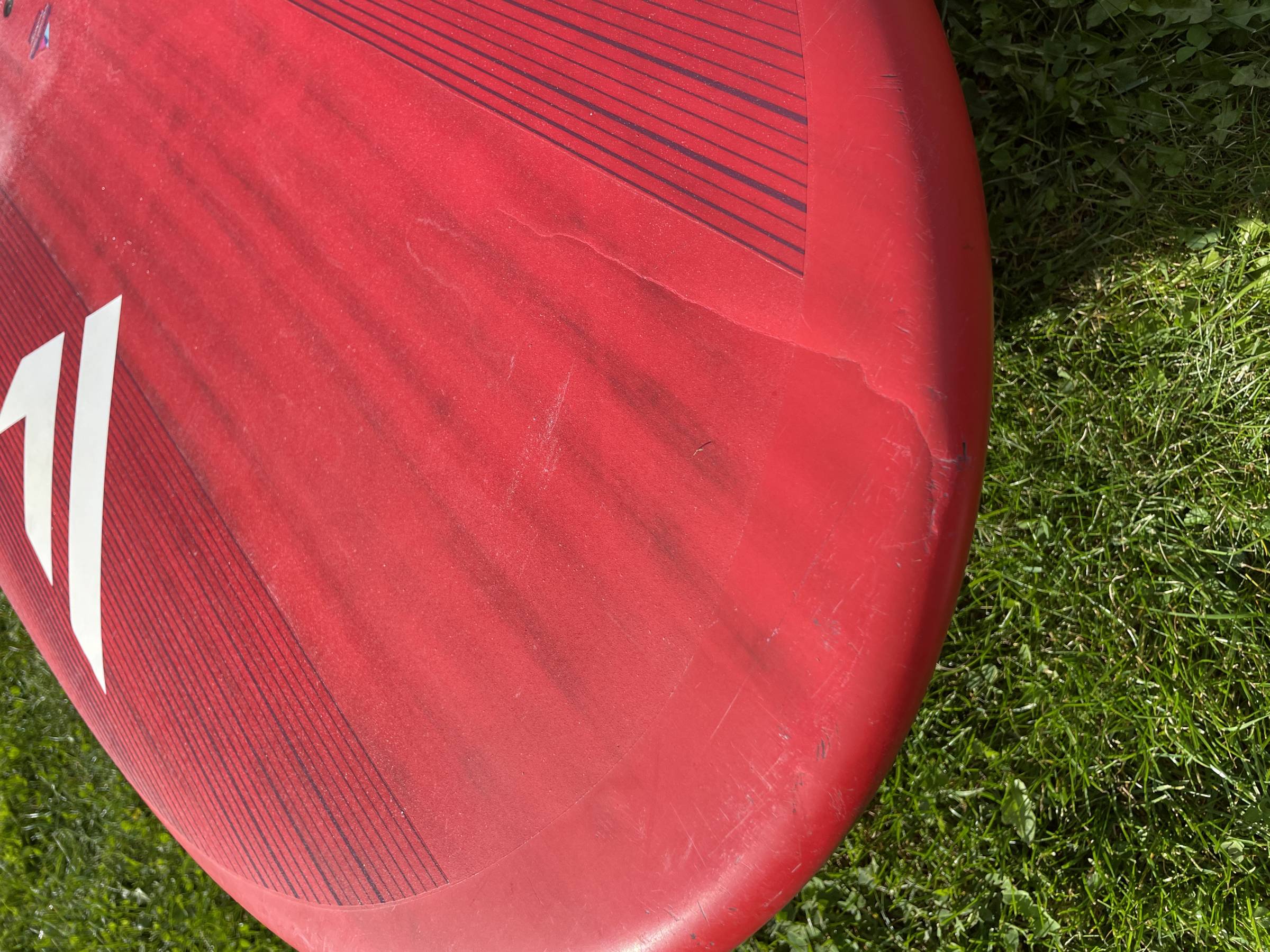 Unten vorne eine kleine Reparatur, welche aber nicht auf der Gleitfläche ist. Ansonsten oben auf dem Deck wurde eine Stelle repariert und es sind ein paar Dellen zu sehen. Das Board ist aber trotzdem nicht weich. An der Nose ist ein langer Einschlag und mehrere kleine Stellen.