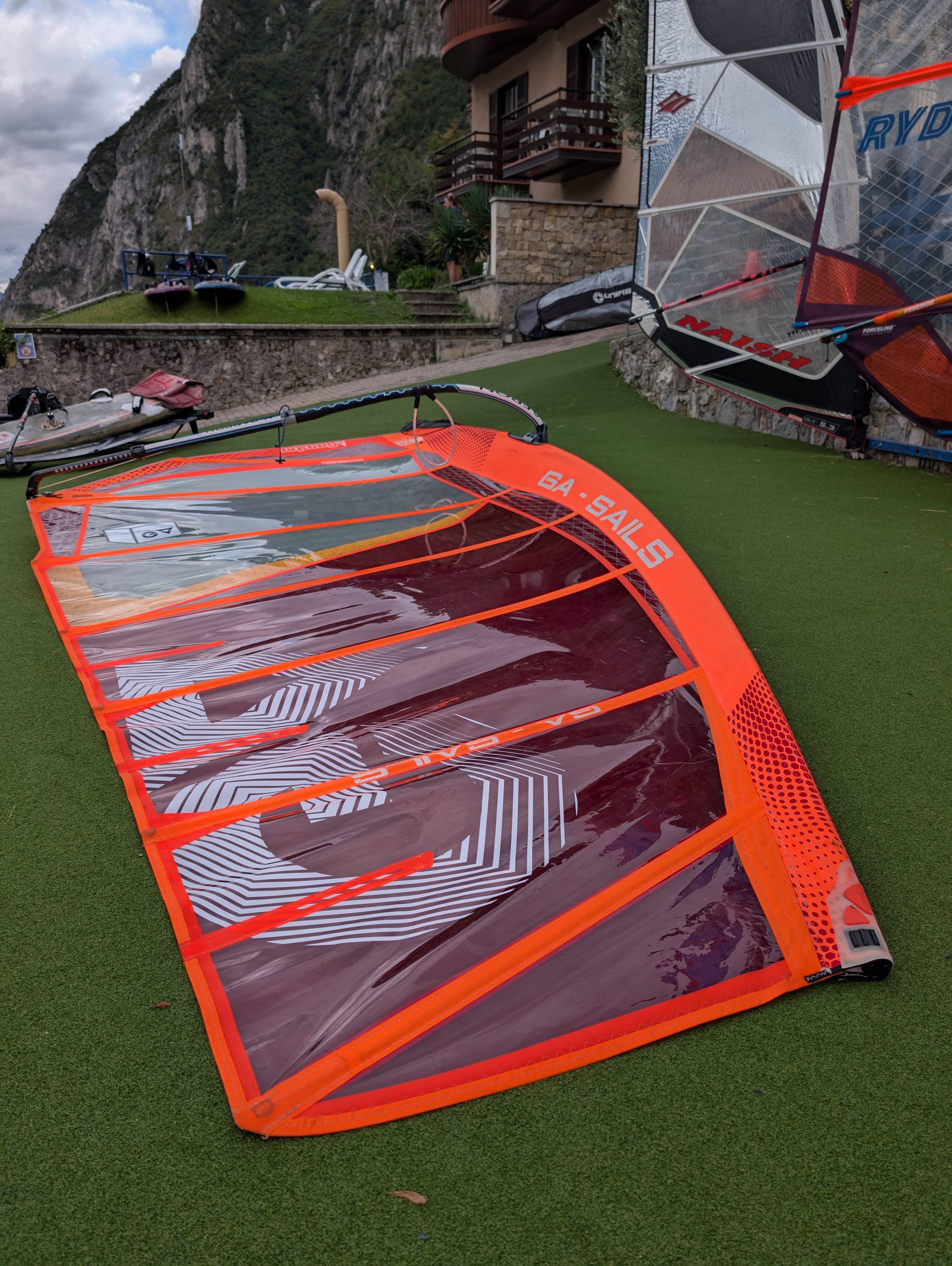 Zustand: Gut bis sehr gut. Keine Risse, Knicke, tiefe Beulen, etc. (siehe auch Bilder). Gabel und Mast ohne Beschädigungen. Übliche Gebrauchsspuren vorhanden. Camber rotieren einwandfrei und das Segel liegt angenehm ruhig in der Hand.