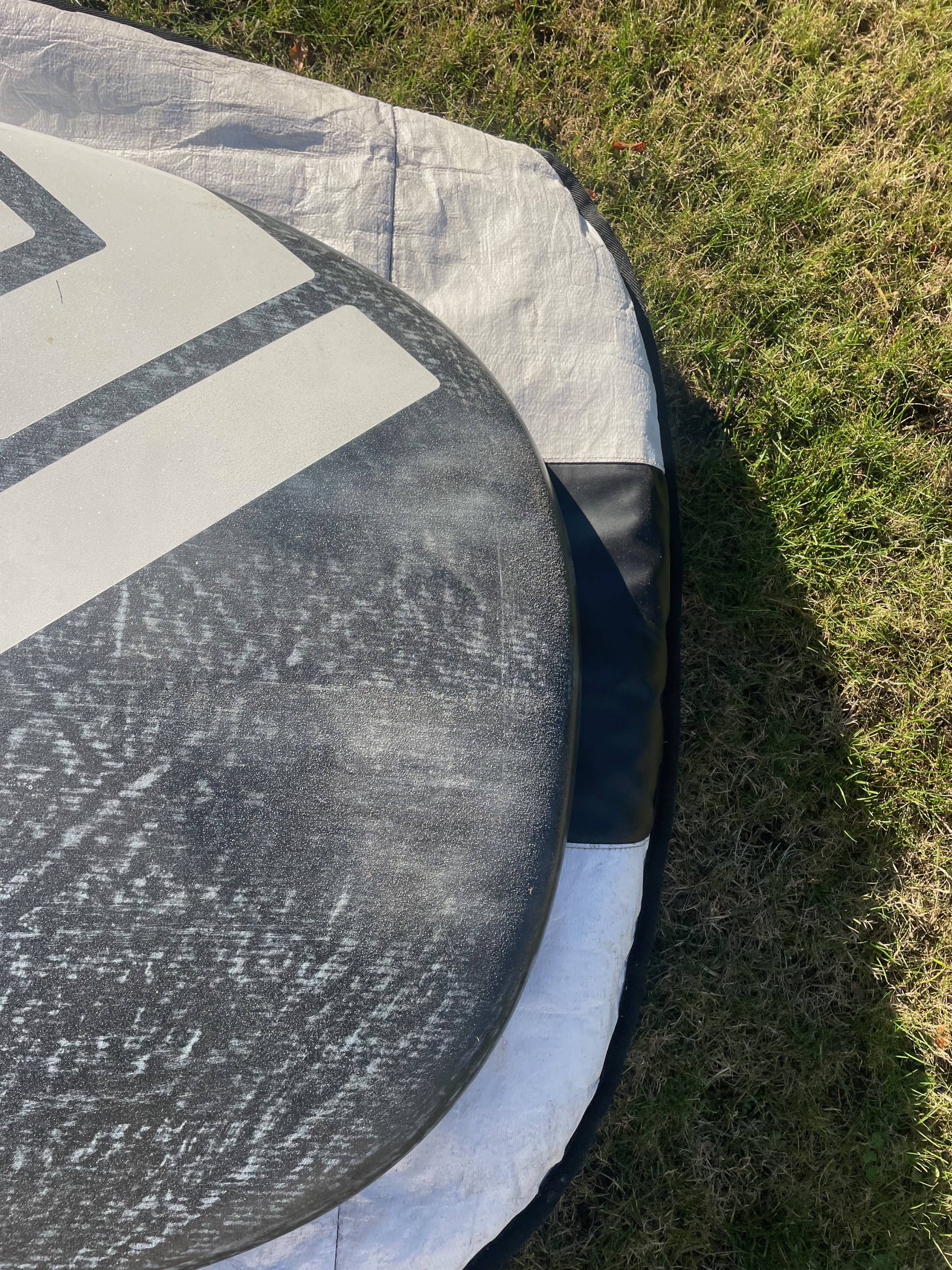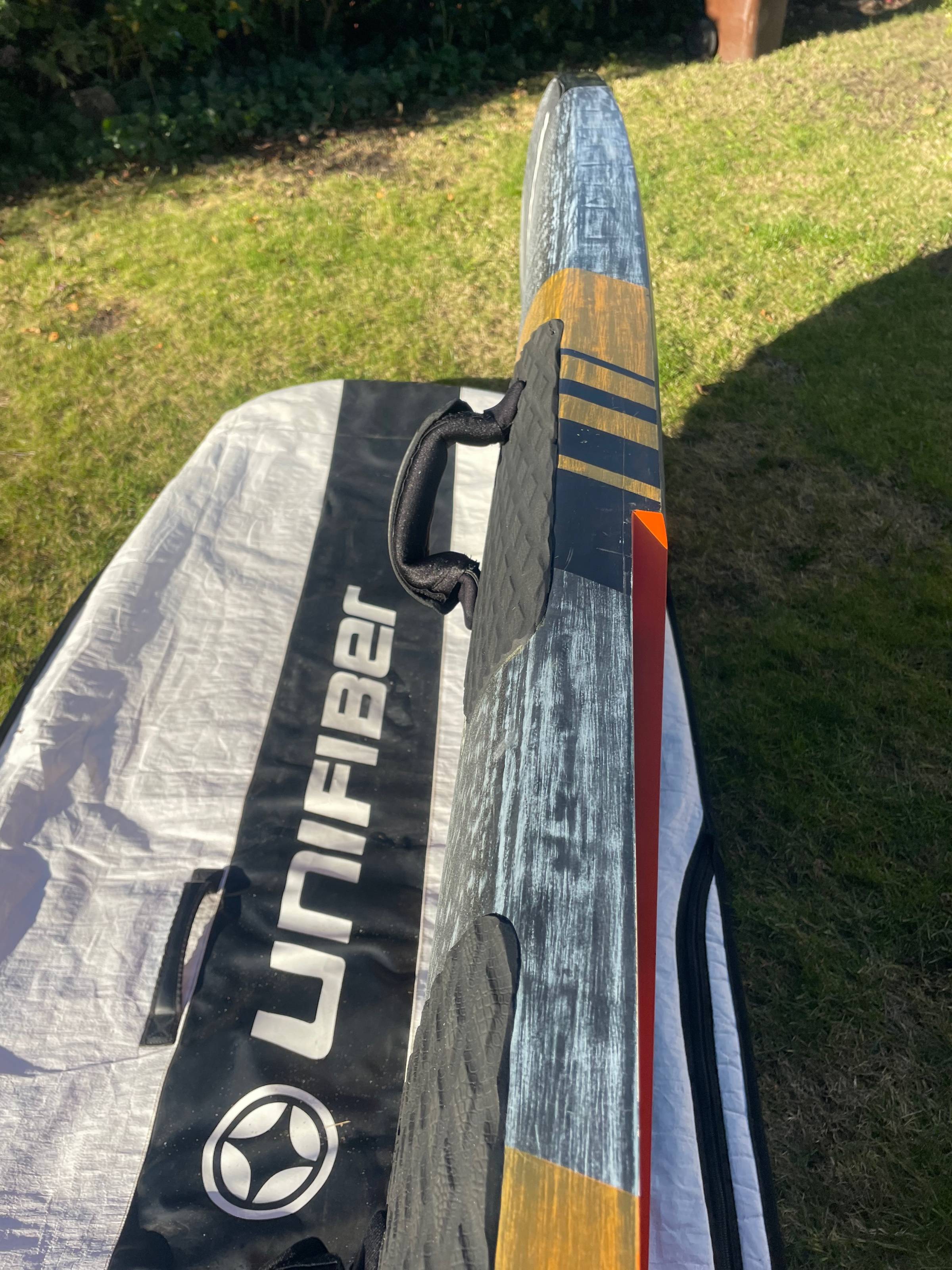 Die Pads und Schlaufen sehen aus wie neu. Der Neupreis liegt heute bei 2700 Euro. Angeboten wird das Board mit einer etwas zu großen Boardbag.
