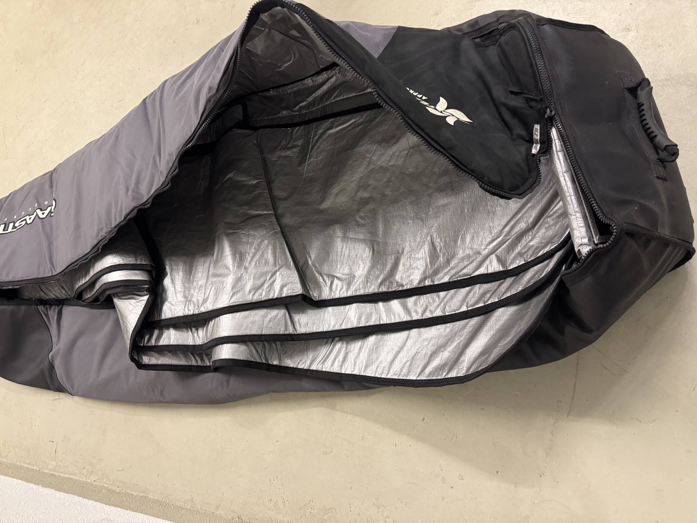 Für den Flugtransport einsetzbares sehr gut gepolstertes hochwertiges Bag. Hohe gepolsterte Kante für bis zu drei Windsurfboiards. Extra Bug- und Heckverstaerkung aus robustem Material Zweimal genutzt, kleine Stelle wurde professionell vom Segelmacher repariert. Reißverschluss läuft top.