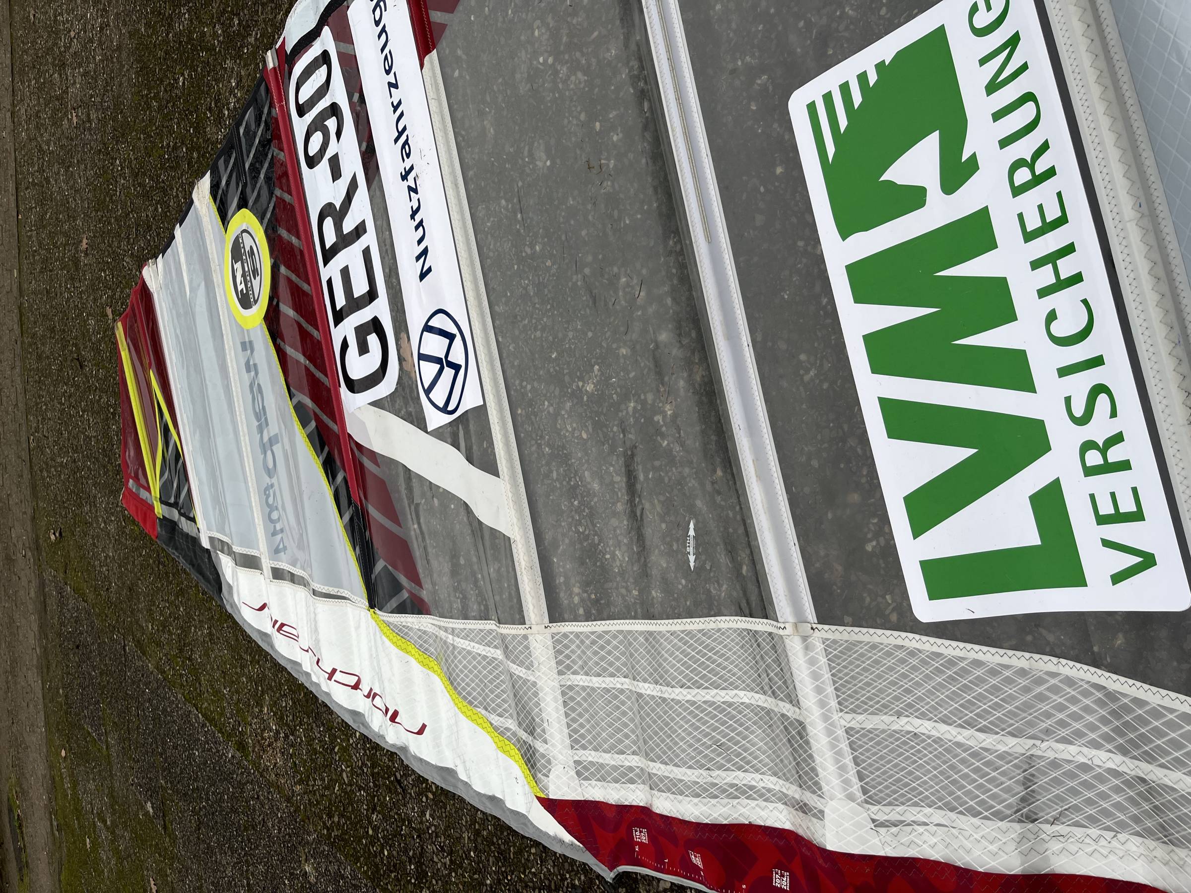 Zustand & Performance: Das Segel befindet sich in einem wirklich guten Zustand. Der Monofilm ist gepflegt und hat lediglich die üblichen, leichten Gebrauchsspuren, die beim Auf- und Abriggen entstehen. Besonders wichtig bei diesem Segel: Die Camber springen einwandfrei um – die Rotation beim Halsen ist für ein Race-Segel dieser Klasse wirklich top. Es fährt sich absolut direkt und stabil.