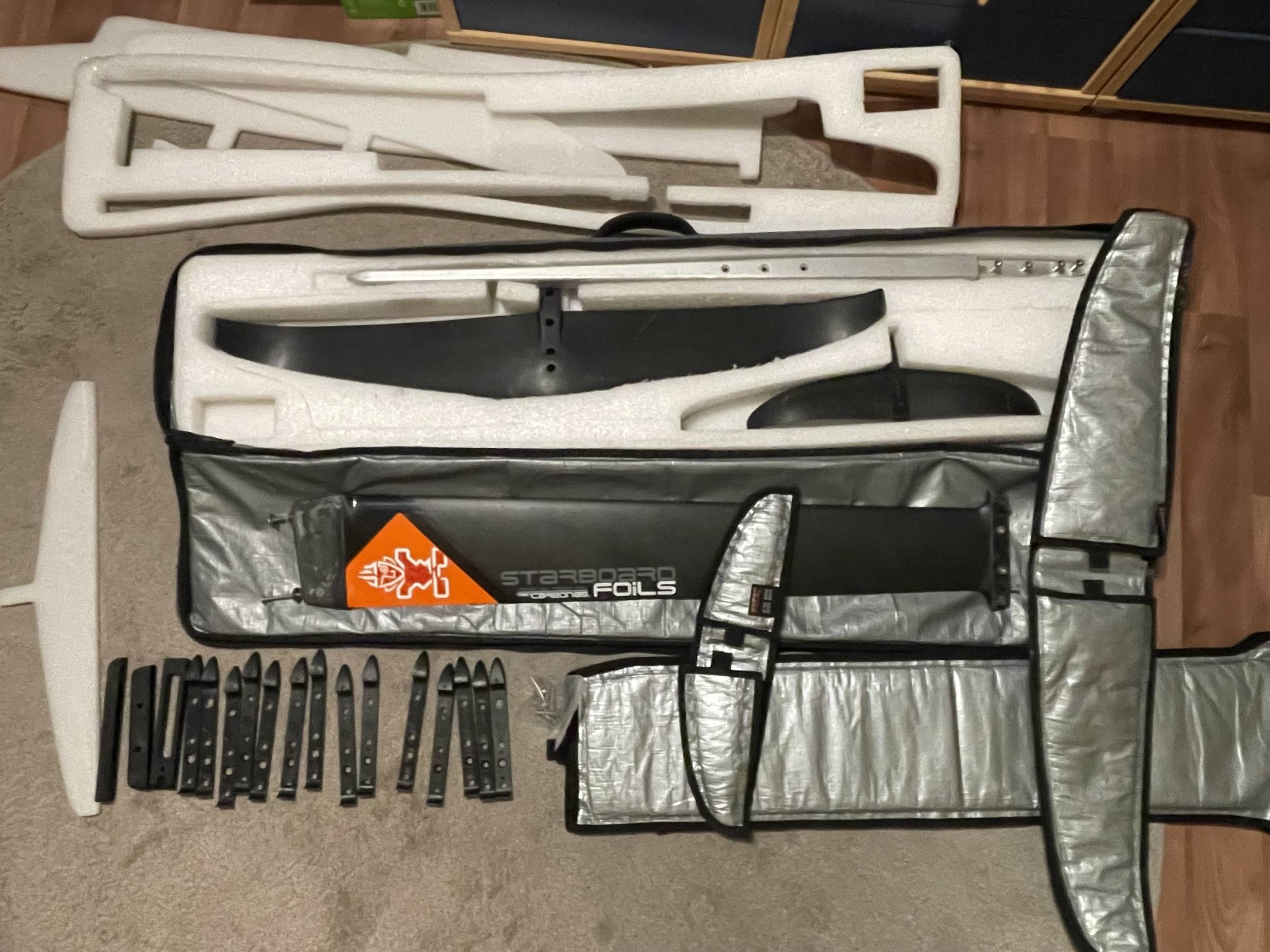 Verkaufe ein Starboard Foil mit einem 900 Evolution Frontflügel, einer 105 Fuse, einem 255 Backwing und einem 85 Carbonmast und dem Taschenset.