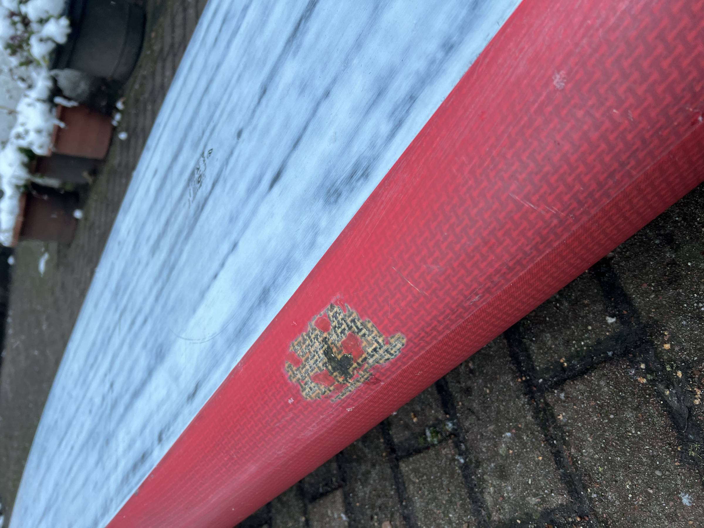 Es gibt eine kleine Reperaturstelle im vorderen Bereich, ansonsten die üblichen Gebrauchsspuren. Das Board ist dicht und hat kein Wasser gezogen. Wenn man möchte, kann man ein bisschen Kosmetik an dem Board vornehmen.