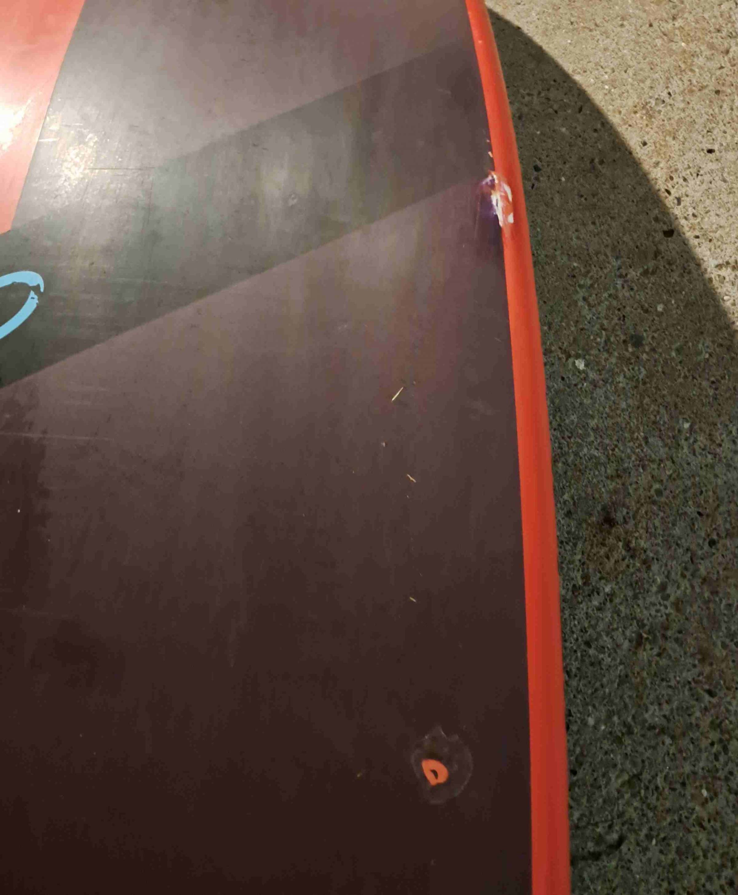 Das Board hat eine professionell reparierte Nase und Gebrauchsspuren (durch Steine am Strand), es hat kein Wasser gezogen, ist nirgends weich: also optisch 3-, technisch top. Ein feines Brett ...