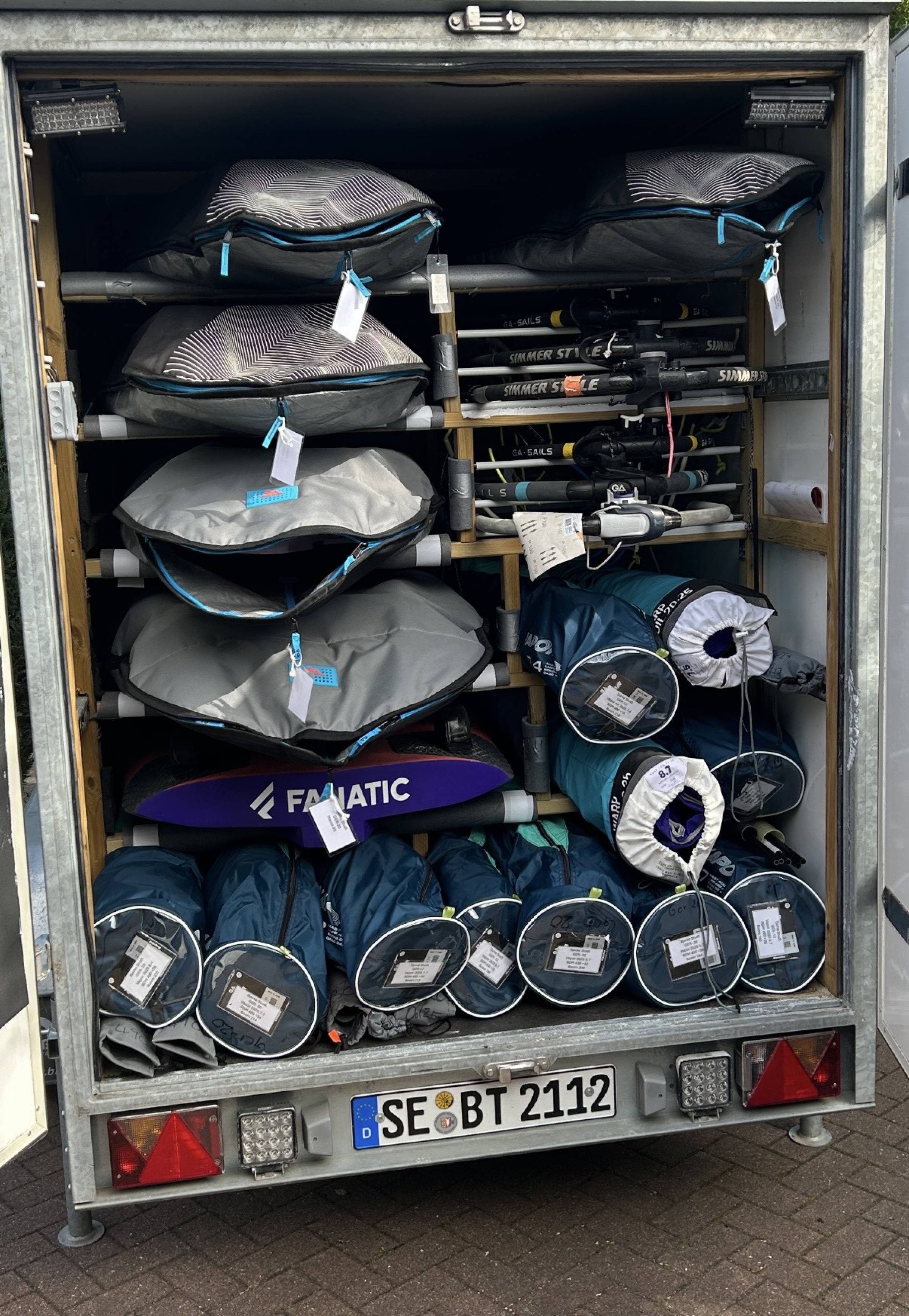 Verkaufe meinen Blyss Kofferanhänger aus 2021, der speziell für Windsurfing-Material umgebaut wurde.
