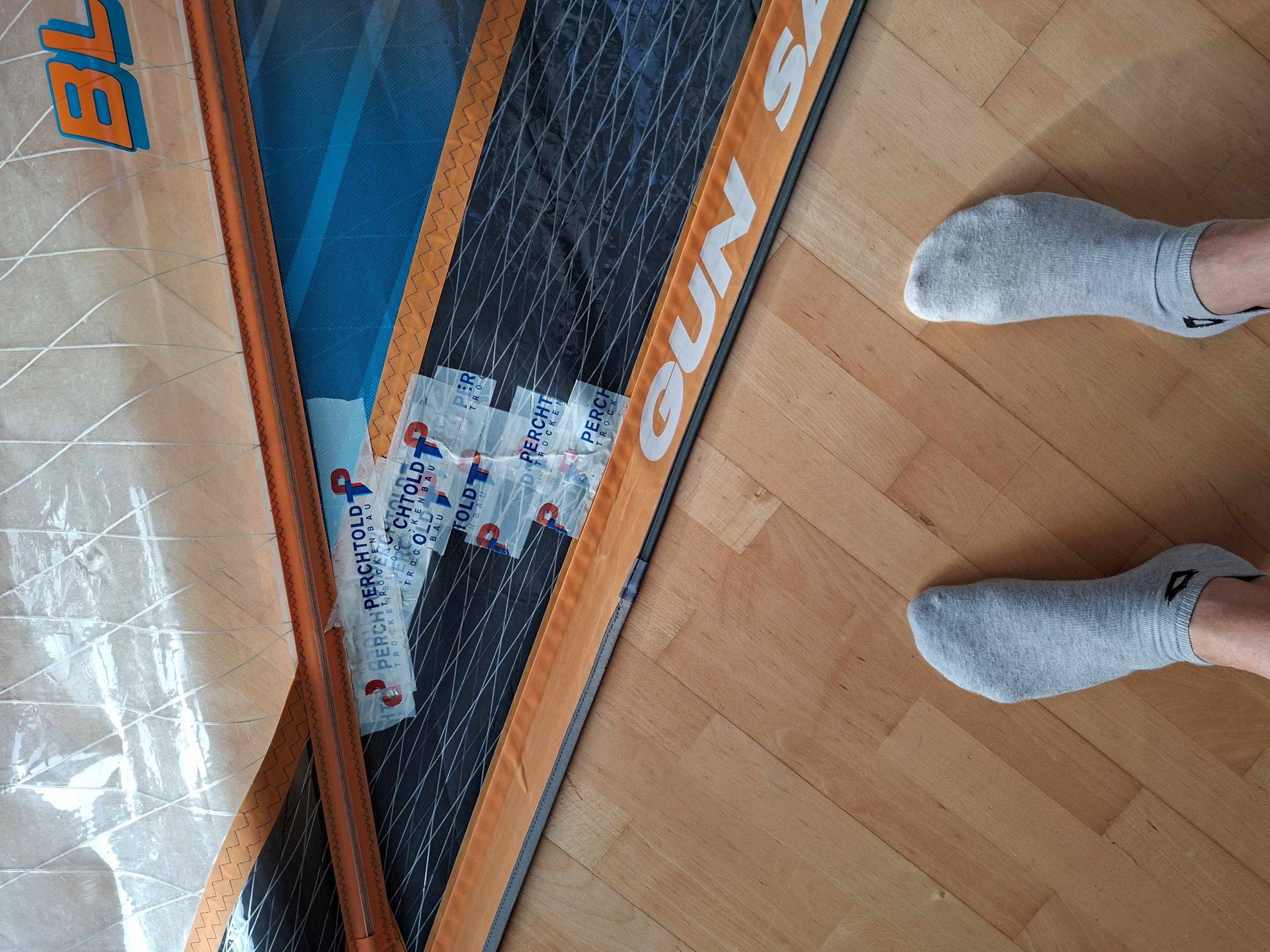 Das Segel hat schon einige gute Tage erlebt. Der Monofilm ist aber immer noch im guten Zustand und sollte daher 2 bis 3 Jahre noch halten. Für Einsteiger wegen des leichten Gewichts (4-Laten) gut geeignet. Der provisorisch reparierte Riss im Monofilm hat schon mehrere Surftage gut überstanden. Mit einem schönen neuen Aufkleber sollte das dann auch gut aussehen.