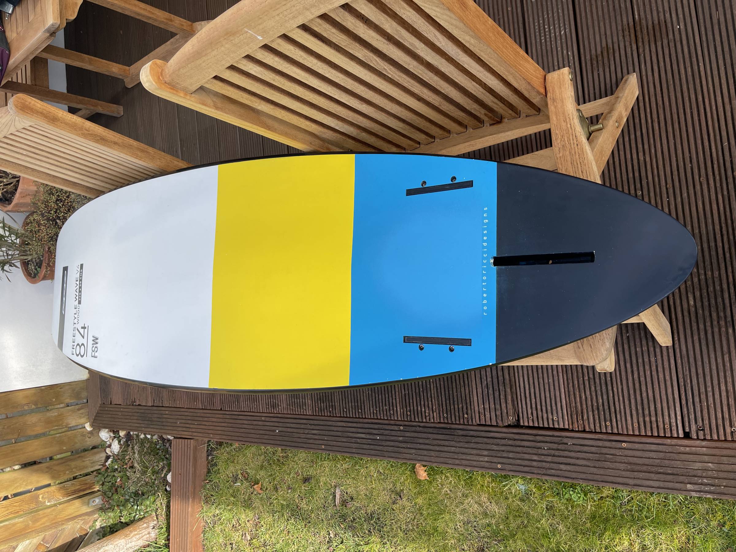 Sehr gut erhaltenes RRD Freestyle Wave V4 Board mit 84 Liter in Woodversion (7,4 kg inkl. Schlaufen). Bj. 2017, Original Schlaufen und Finne. Twin Fins nicht enthalten. Kein Versand.