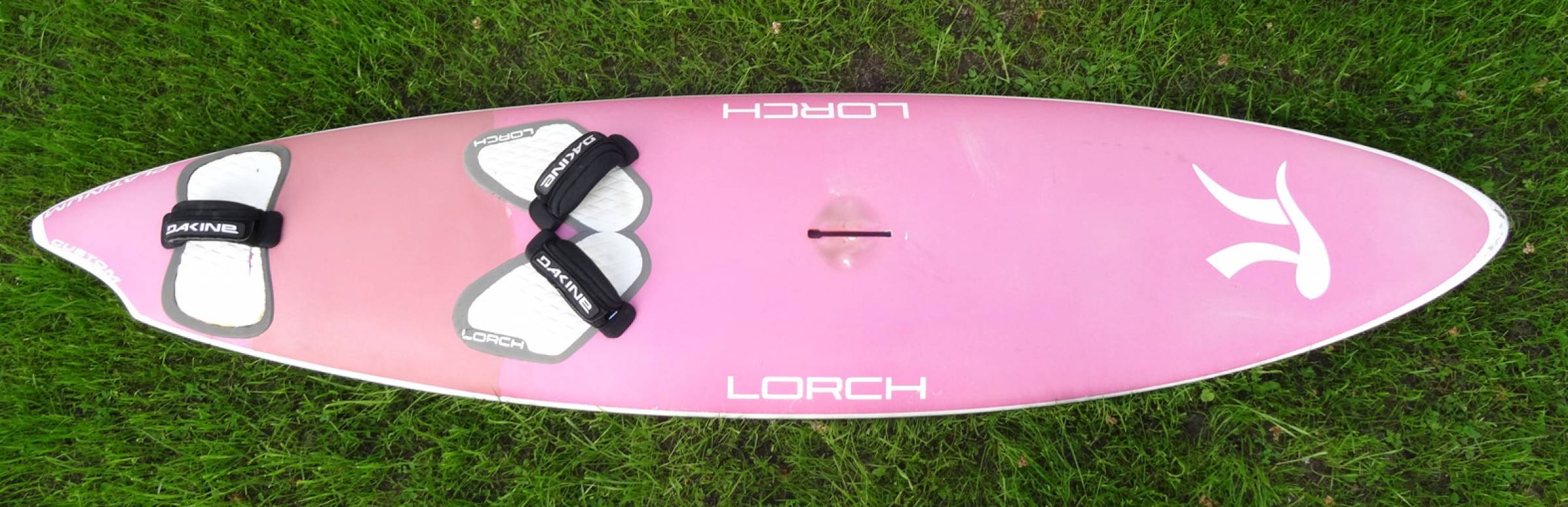 Das Board ist ausgerüstet mit Schlaufen und der kleinen Finne für die Bottomturnseite und wiegt mit dieser Bestückung präzise 6 kg. Laminat und Standlack des Bereichs, wo beim Halsen der hintere Fuß steht, wurde von einem professionellen Shaper neu aufgearbeitet und ist nun wieder knüppelhart und belastbar. Es liegen keinerlei Schäden, geschweige denn weiche Stellen vor. Das Board hat noch nie Wasser gezogen.