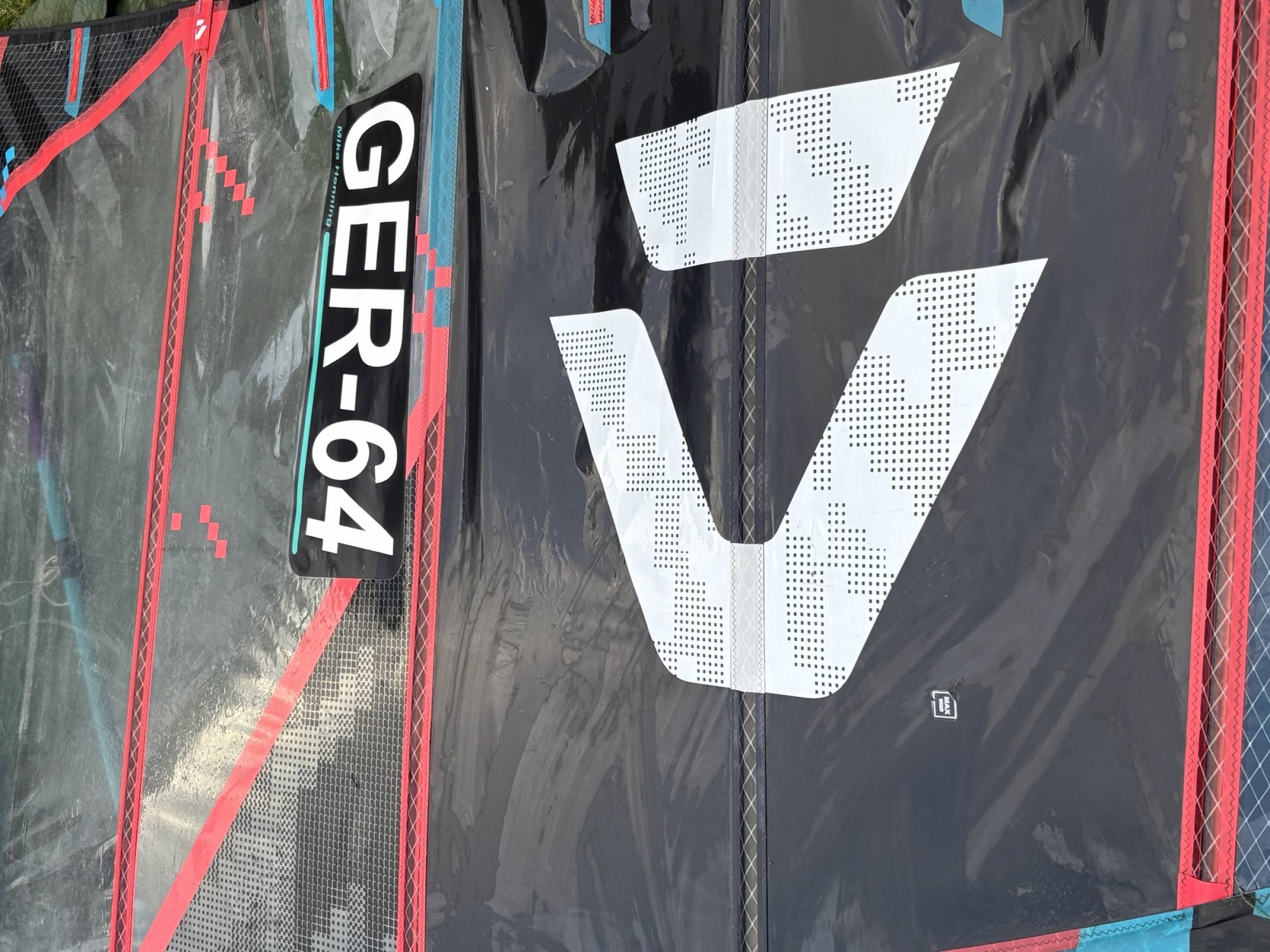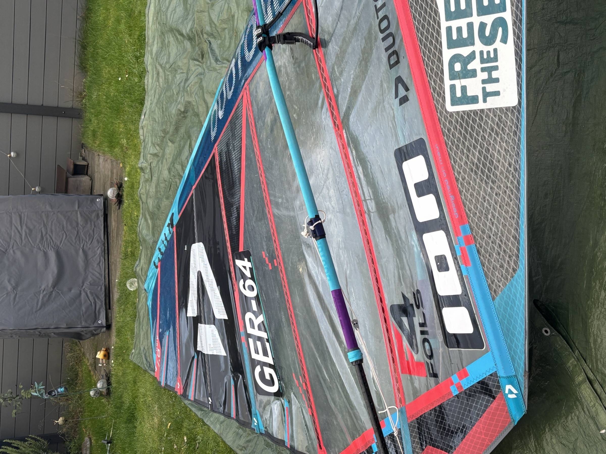 Das Segel hatte im Bereich des Duotonezeiches ein kleines Loch, das wahrscheinlich durch eine Finne beschädigt wurde. Dieses ist mit Monofilm repariert und nicht wirklich sichtbar. In diesem Bereich liegt keine Spannung auf dem Monofilm, also harmlos.