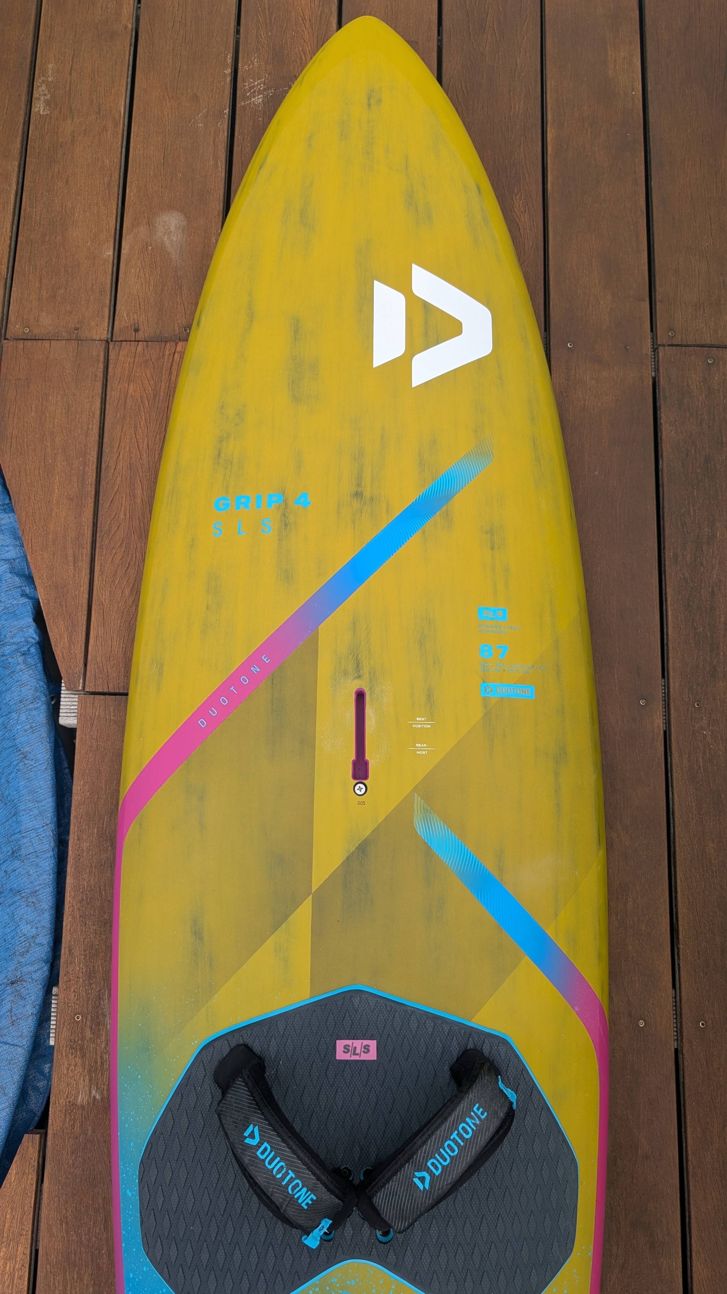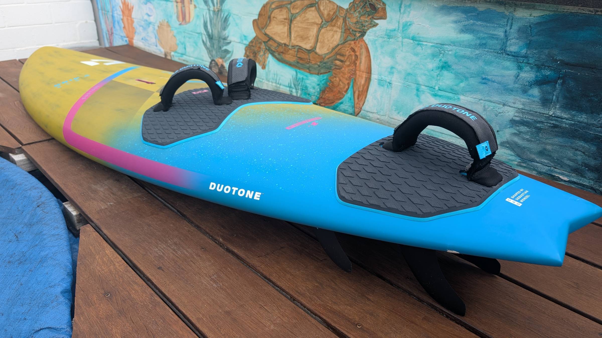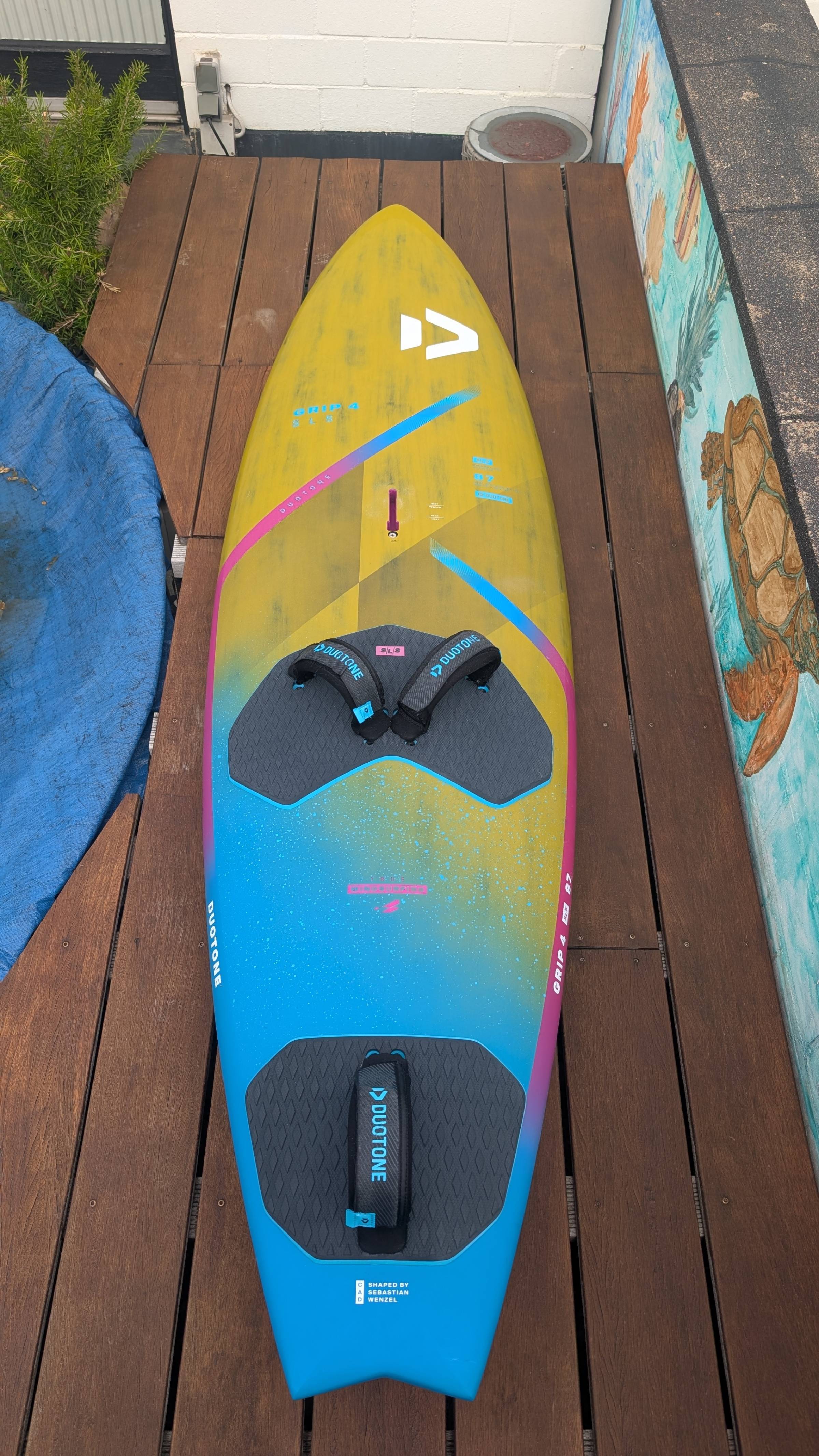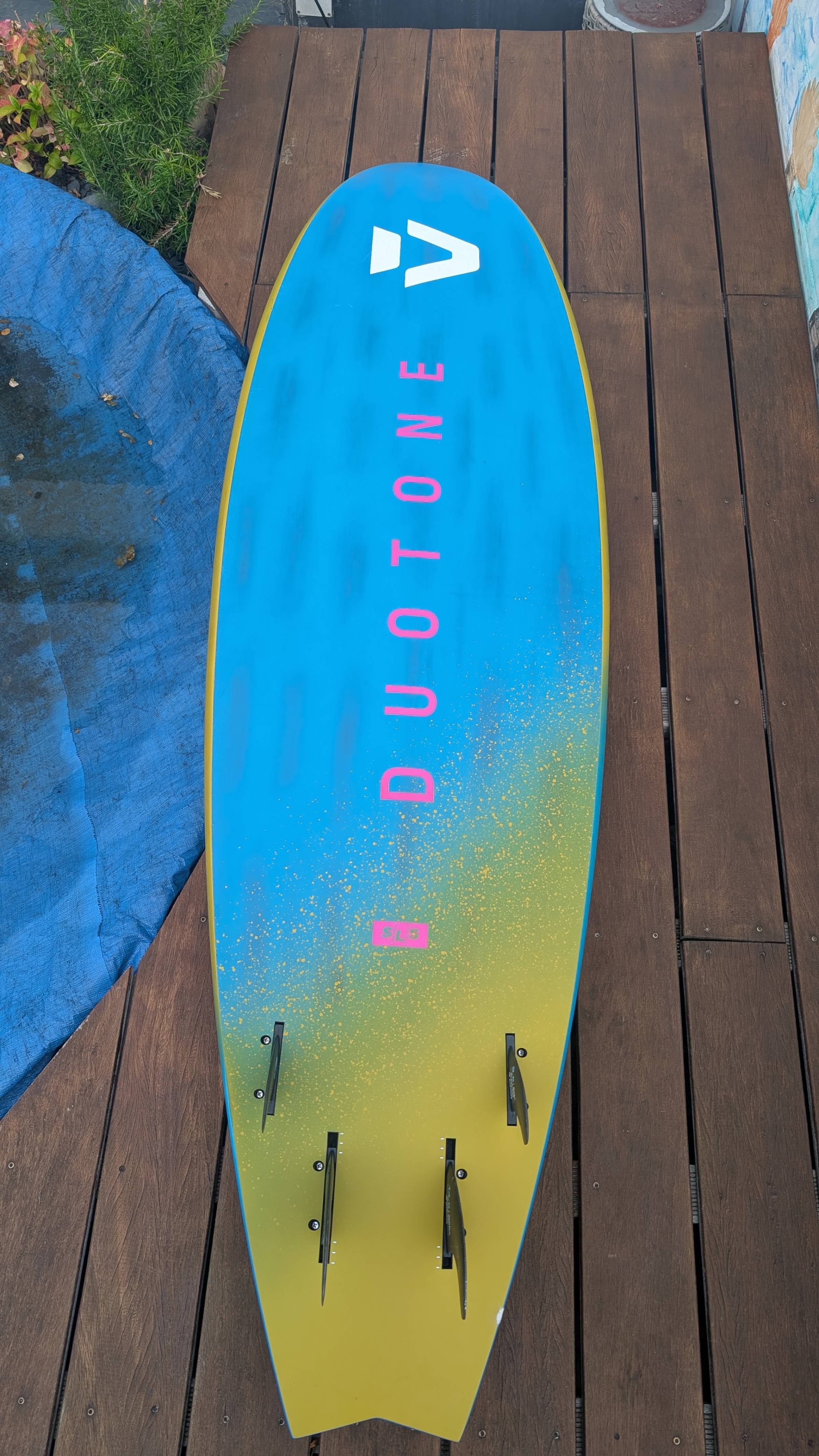 Das Brett ist bis auf einen kleinen Abplatzer (an Land passiert) neuwertig. Schlaufen und Finnen ebenso.