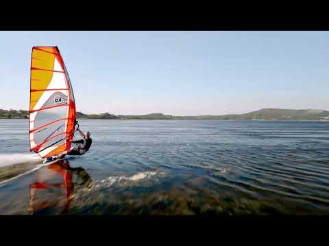 Windsurfen auf extremem Flachwasser. Der Wind scheint die Wasseroberfläche kaum zu berühren.