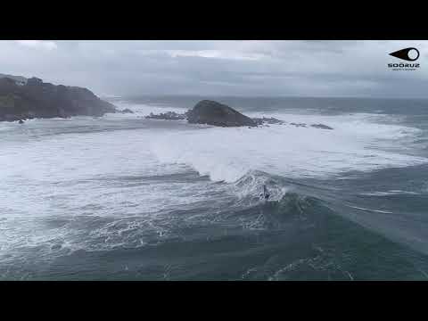 Das sind mal wieder dicke Wellen am Atlantik. Thomas Traversa während des Sturms Bella am Cabo Higuer im Baskenland. Stephane Debuire (StefVideo) hielt die Action mit der Kamera fest.